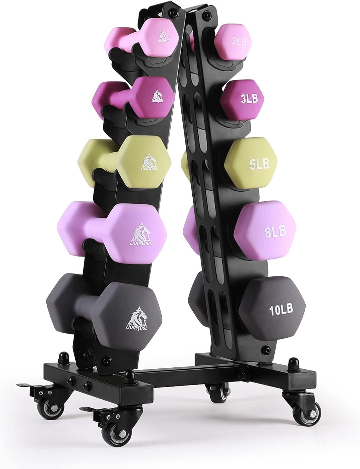 The Portable Rolling Dumbbell Rack: With four 360 degree swivel wheels, this versatile piece is ready to roll into any room. Featuring sleek matte black finish, heavy duty steel and anti-slip rubber cushion, the sturdy Lionscool rolling dumbbell rack is built to provide heavy duty storage and make moving the whole dumbbell set much easier.