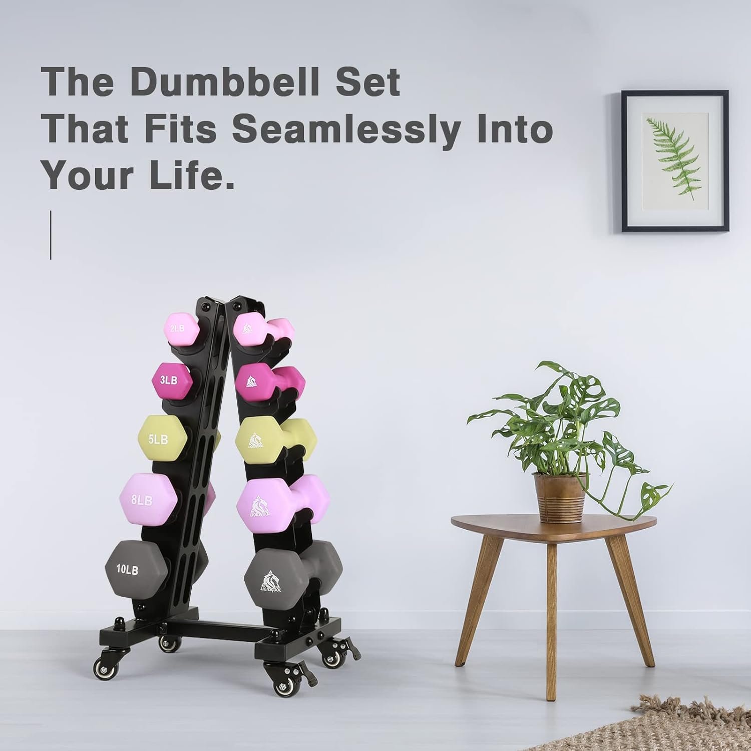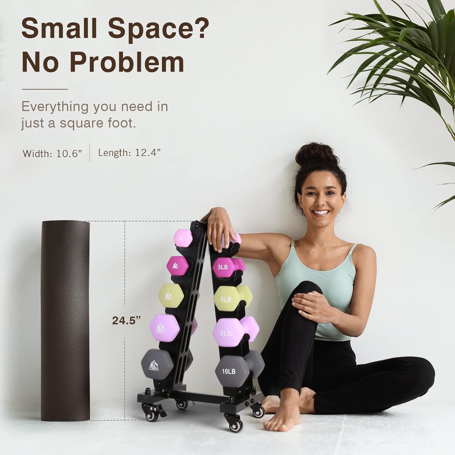Space Saving: This Lionscool dumbbell set is designed for even the smallest of spaces. Taking up a smaller footprint than your slim bedside table, the rolling dumbbell rack is ready to hold everything in just a square foot. What about the height? Well, you can simply take out your yoga mat and compare with it. The height of the rack is the same as the height of an average rolled-up yoga mat, which is 24 inches.