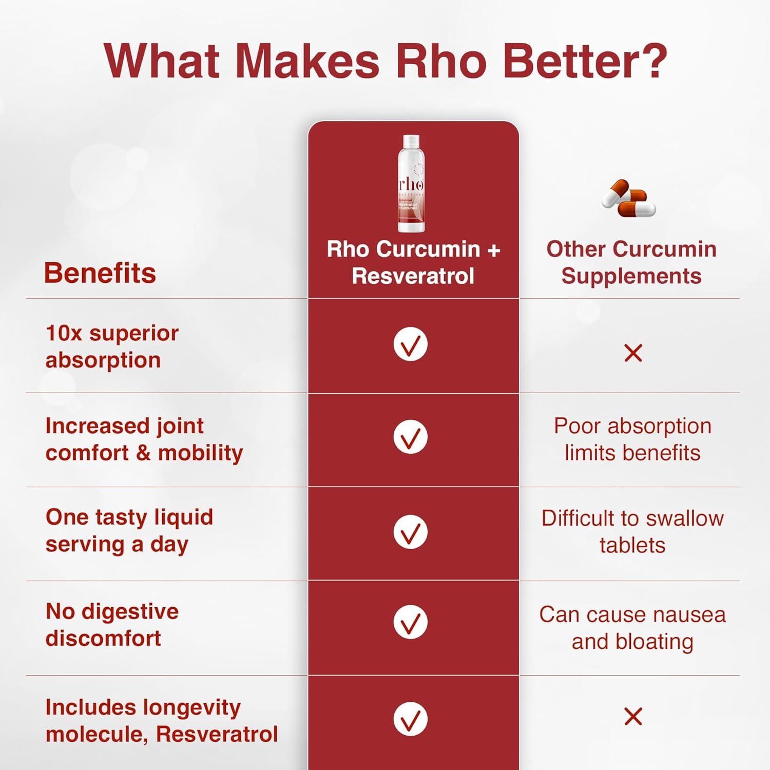 10X BETTER ABSORPTION: Liposomal technology encapsulates Curcumin and Resveratrol in tiny pouches similar to cell membranes, increasing bioavailability and absorption by up to 10X. Liposomal encapsulation enhances Curcumin absorption by at least 9-fold compared to supplements with black pepper extract (piperine). Rho bypasses the digestive system, ensuring superior absorption over traditional capsule, pill, and powder curcumin supplements prone to minimal absorption and potential side effects.
