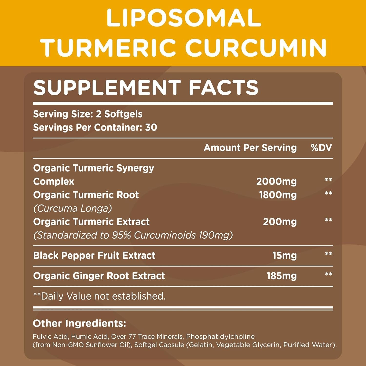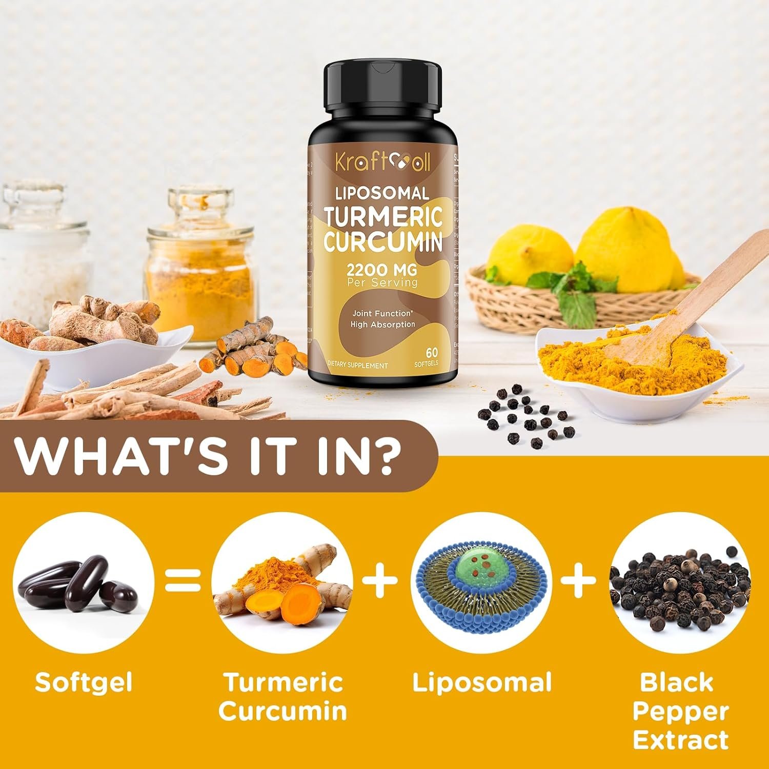 Liposomal Turmeric Curcumin 2200 mg with Black Pepper for High Absorption & Joint Function, 60 Softgels (2 Bottle)