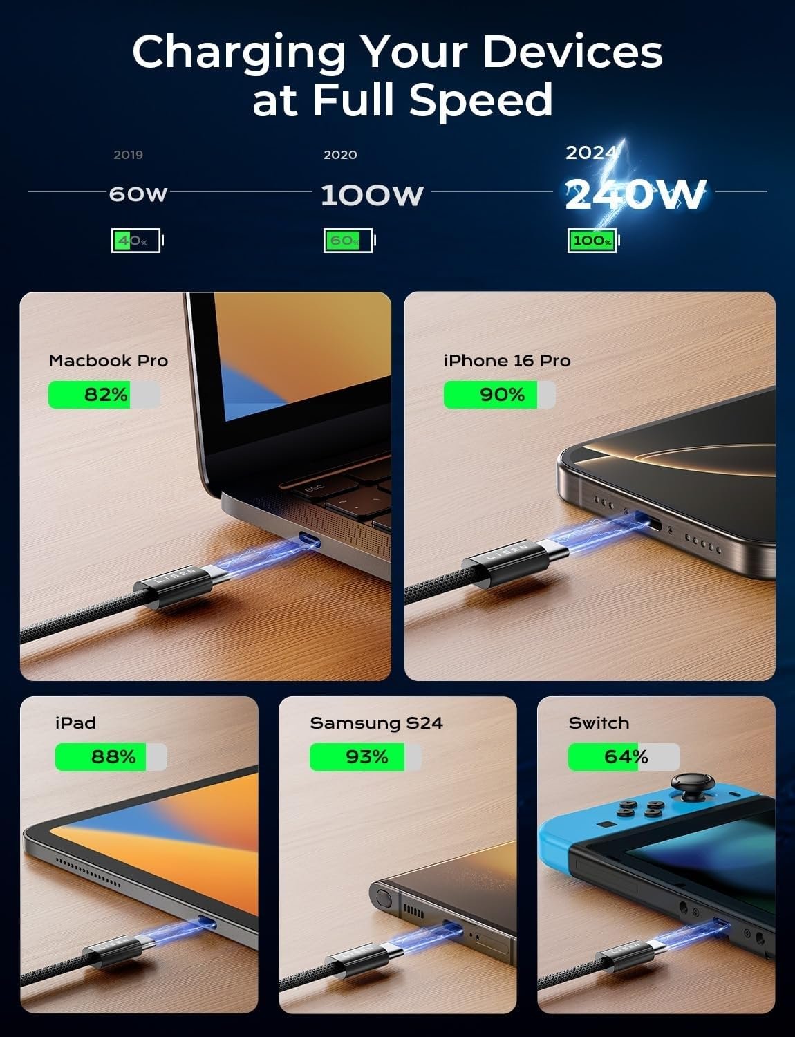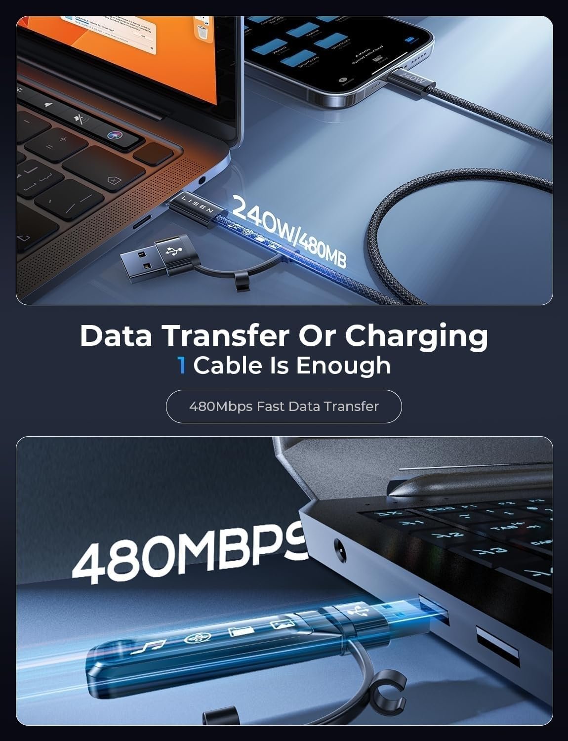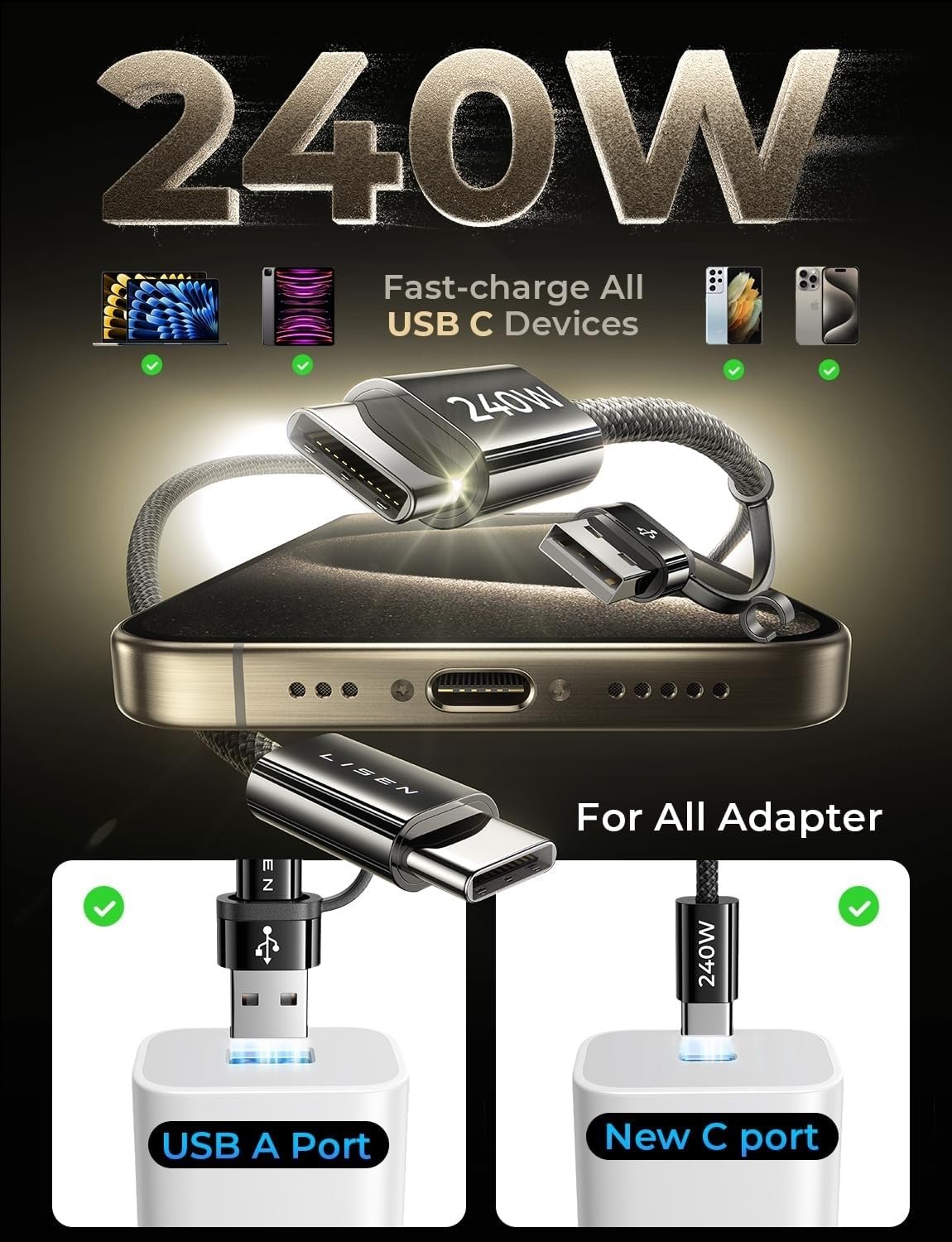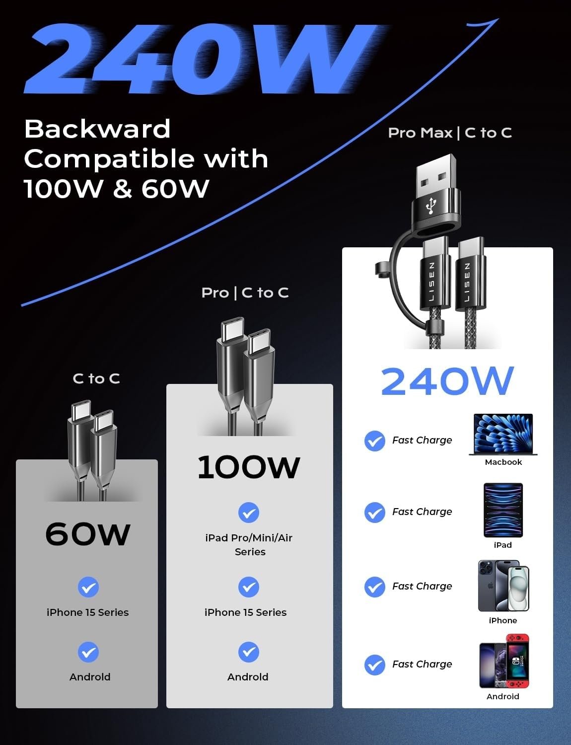 【Future-oriented charging solution】 Lisen 240W USB C cable, designed for iPhone 16, is backward compatible with 100W, 60W and 30W charging standards, making it a perfect upgrade for your existing cables. No need to purchase an additional Usb to Usb C Adapter, you can directly enjoy the latest and fastest iPhone charger fast charging experience, one-step, worry-free for the future