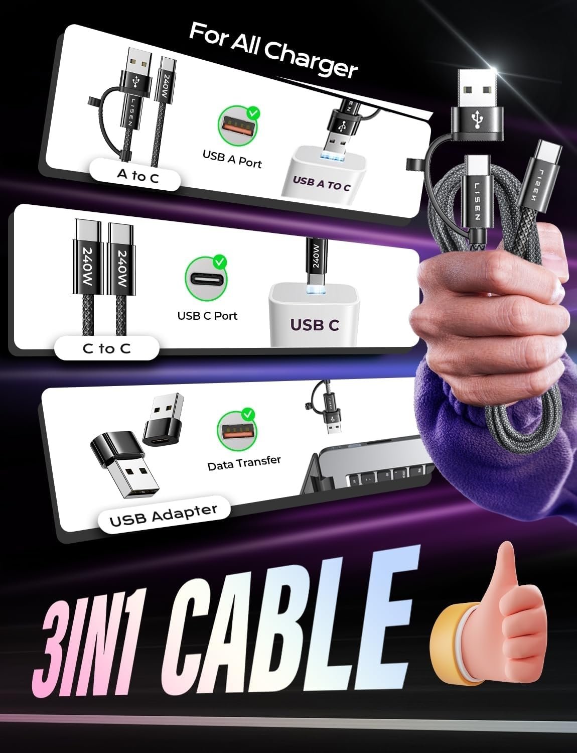【All-round compatibility, one cable for multiple uses】 Lisen 240W Type C charger fast charging adopts an innovative Usb to Usb C Adapter design, which is fully compatible with charging interfaces. It not only supports charging from USB to USB C cable, but also satisfies the seamless connection from USB C to USB C. This USB C cable is an ideal choice for charging multiple devices