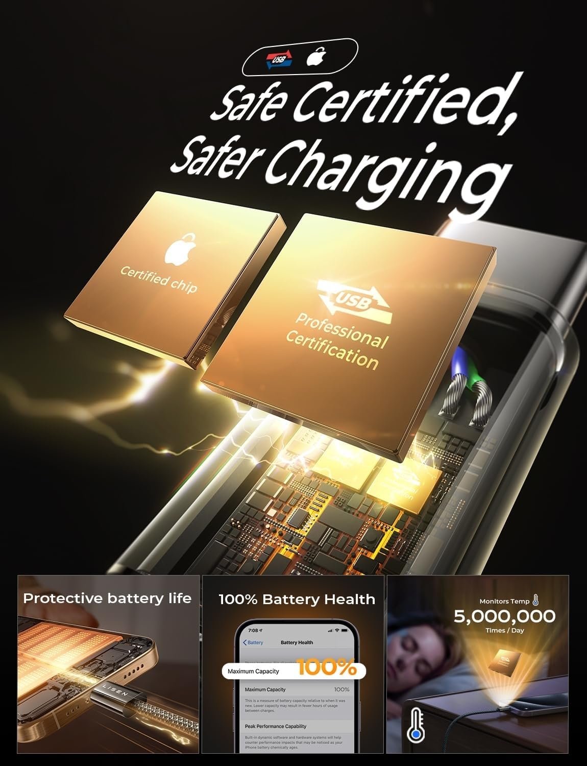 【Official certification, ultra-fast and safe】Certified for fast and secure charging, Lisen’s 240W USB C cable is officially certified to ensure your device’s safety while charging. With a smart chip inside, it controls the current just right, delivering up to 240W of super-fast charging. Choose Lisen for a faster, safer iPhone charge