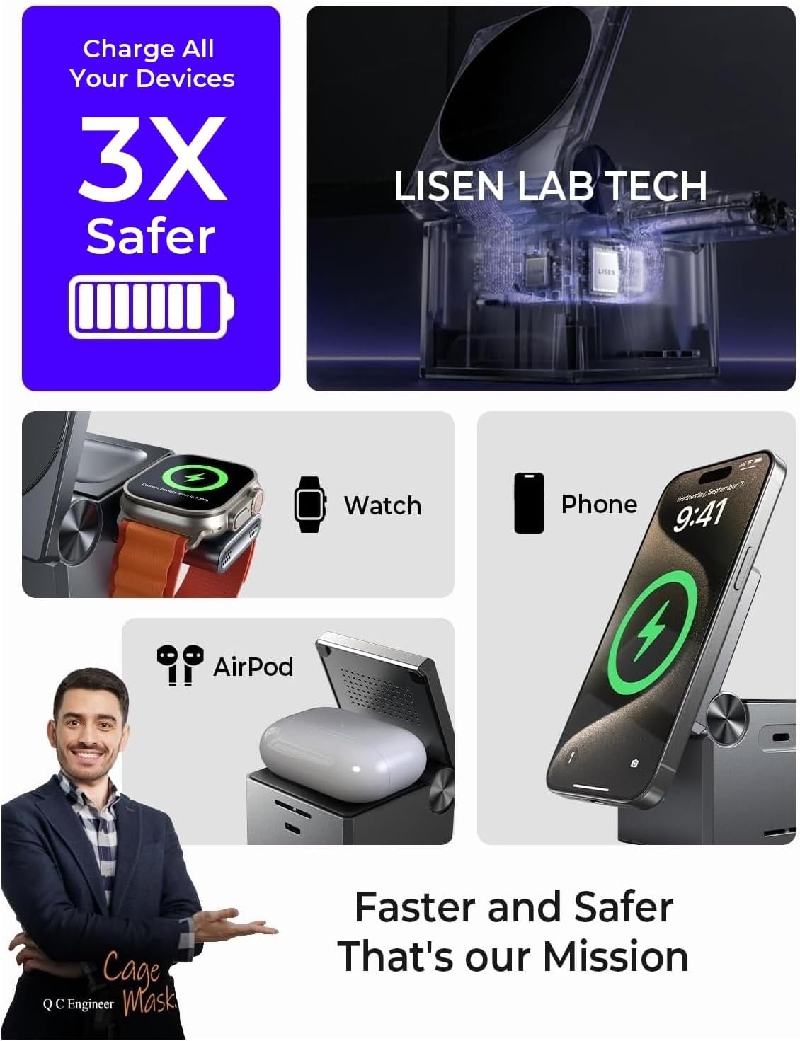 Important Information Before Purchasing: Please note that while the LISEN 3-in-1 portable masgafe charging station adheres to national standards, its charging speed is slower than wired charging. However, LISEN ensure that its charging rate is not inferior to other products on the market, keeping your devices’ batteries healthy before your outings.