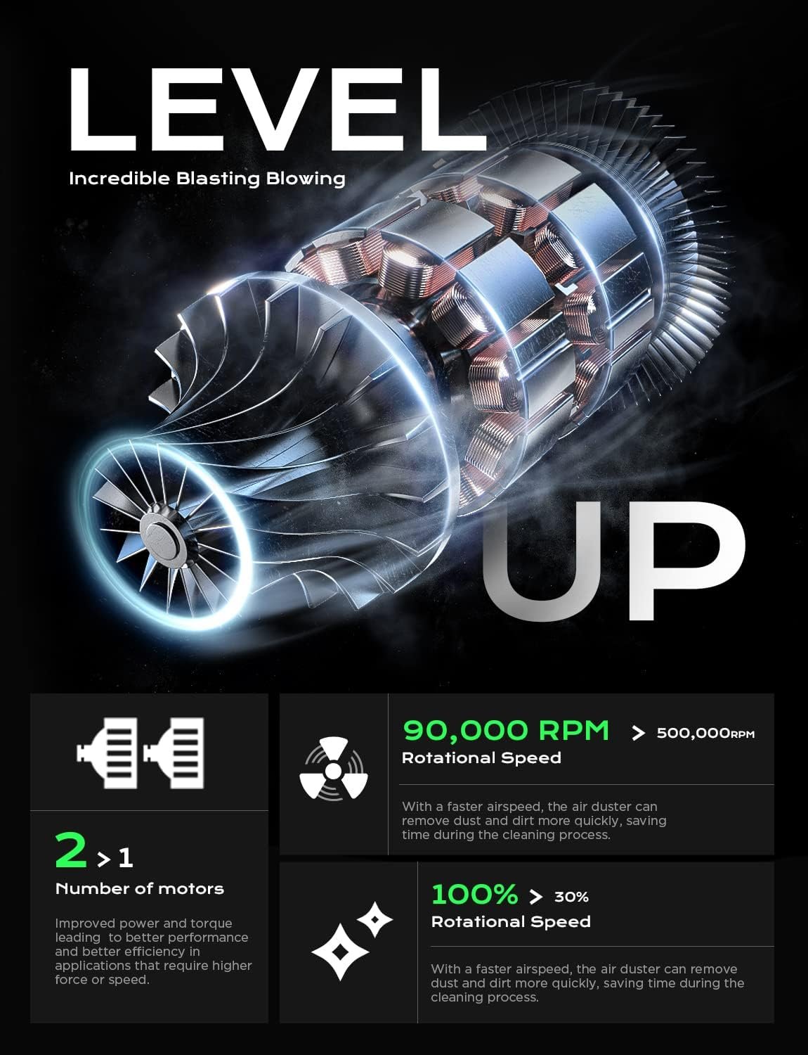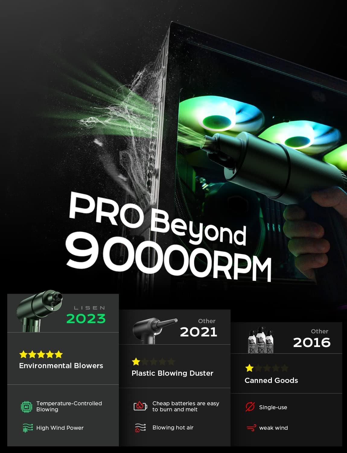 [Powerful Dual Motor System] LISEN Air Duster features a powerful dual motor system that generates a high-speed airflow of up to 90000RPM, making it an incredibly effective tool for removing dust and debris from hard-to-reach areas. With this level of blowing speed, the air duster is capable of blasting away even the toughest dirt and grime, ensuring a thorough and efficient cleaning every time.