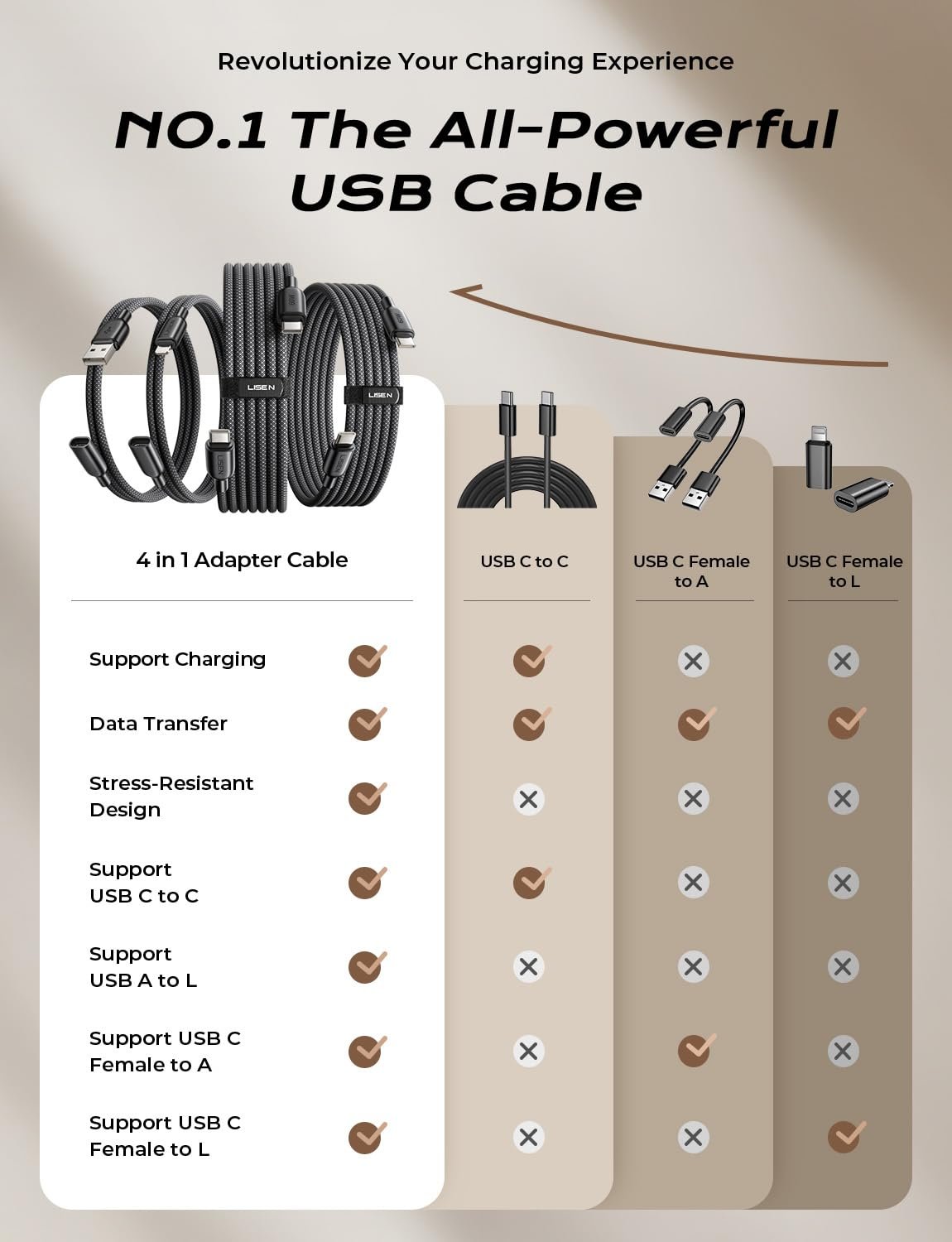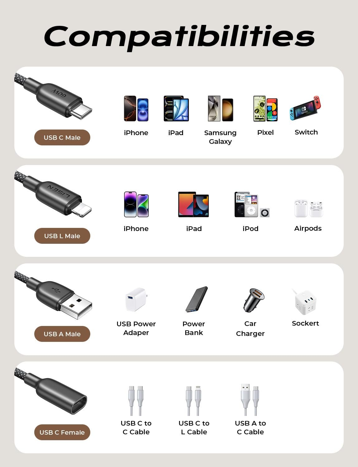 The lisen multi-function cable is compatible with most USB-C devices, usb-L devices, and usb A port chargers, providing you with a variety of charging options to ensure broad compatibility