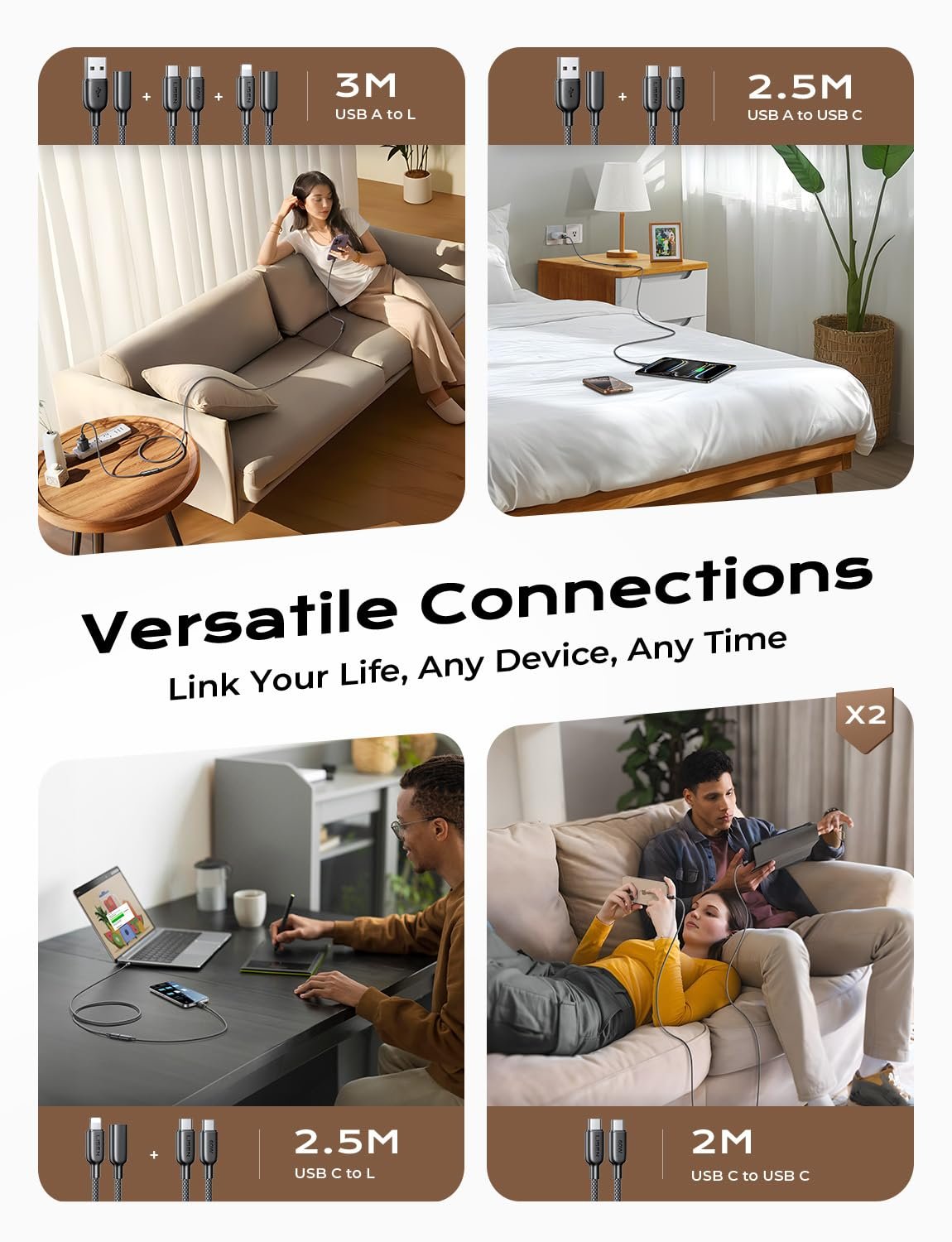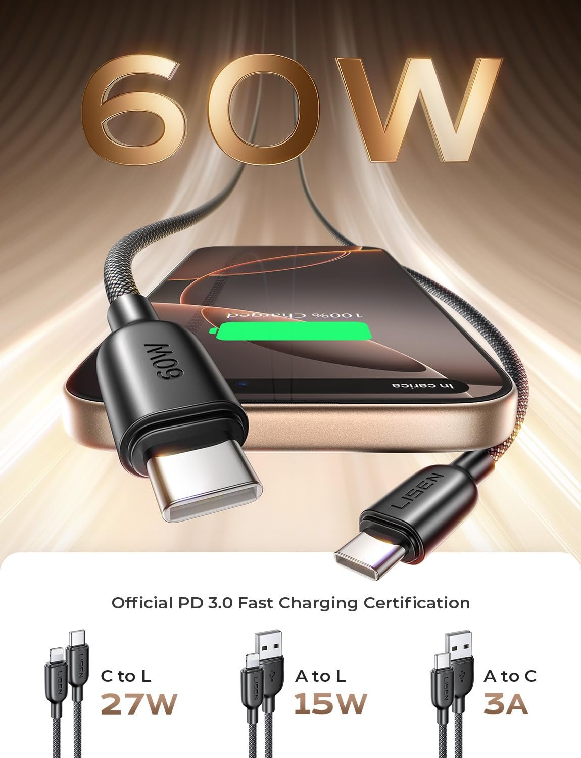 This 4-in-1 cable offers fast charging: up to 60W with USB-C to USB-C, 27W with USB-C to Lightning, and 15W with USB-A to Lightning. The USB-A to USB-C connection supports up to 3A, ensuring quick and efficient charging for your devices.