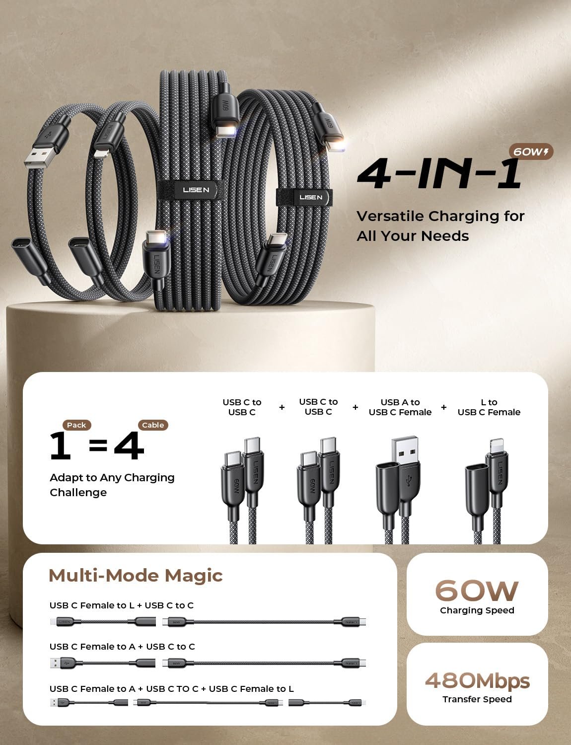 ![LISEN Multi Charging Cable, Set [4-Pack] Lightning Fast 4 in 1 Charging Cable with 60W USB C to USB C Female to USB A, 1.6FT Lightning Extension Cable for iPhone 16/15/14/13/12 Pro max, Samsung S24/23 - Image 5](https://topleaseyou.store/wp-content/uploads/2024/12/71SfW67ExSL._SL1500_.jpg)