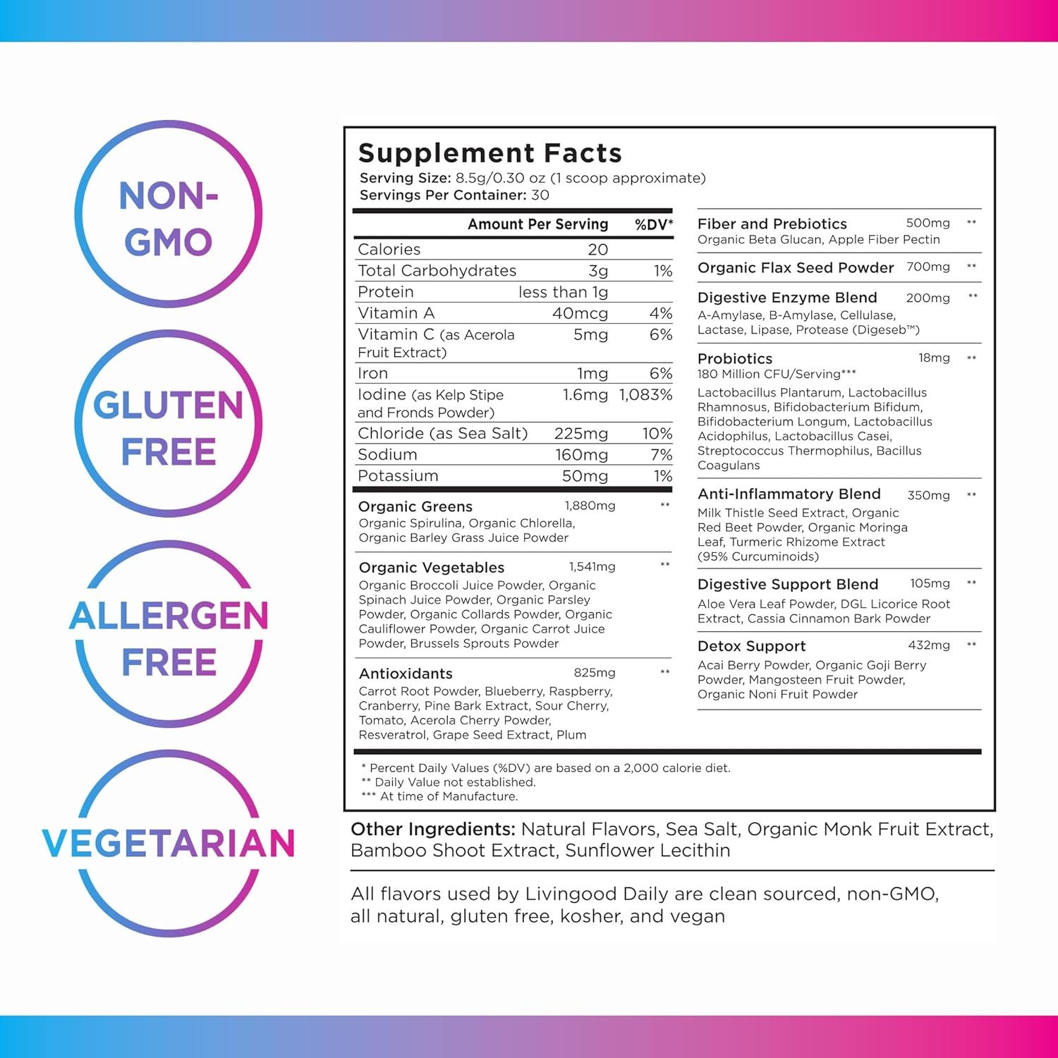 Works With Any Lifestyle: Livingood Daily Greens + Superfoods is gluten, allergen and GMO-free. It’s also vegan making it easy to incorporate into any health journey.