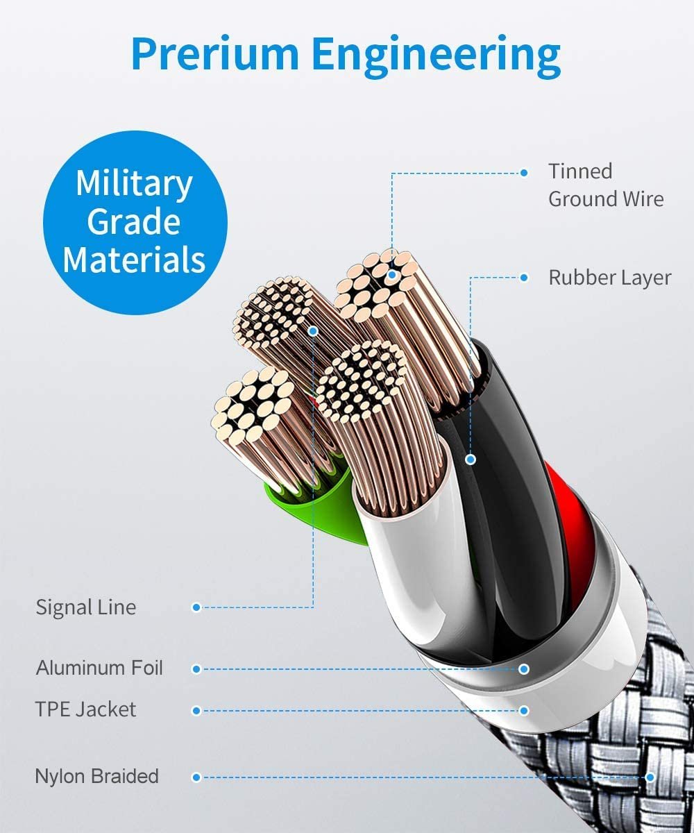 EXCELLENT DURABILITY: Tangle-free nylon jacket, more flexible, long-lasting and Wear-resistant. Up to 40,000+ bend and 32,000 plugging & unplugging lifespan. Enhance strain relief support, Sturdy Aluminum connector, not easy to deform or split.
