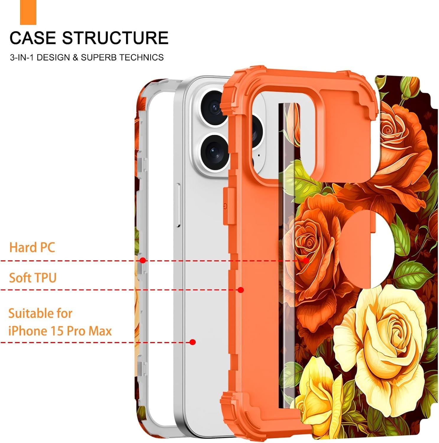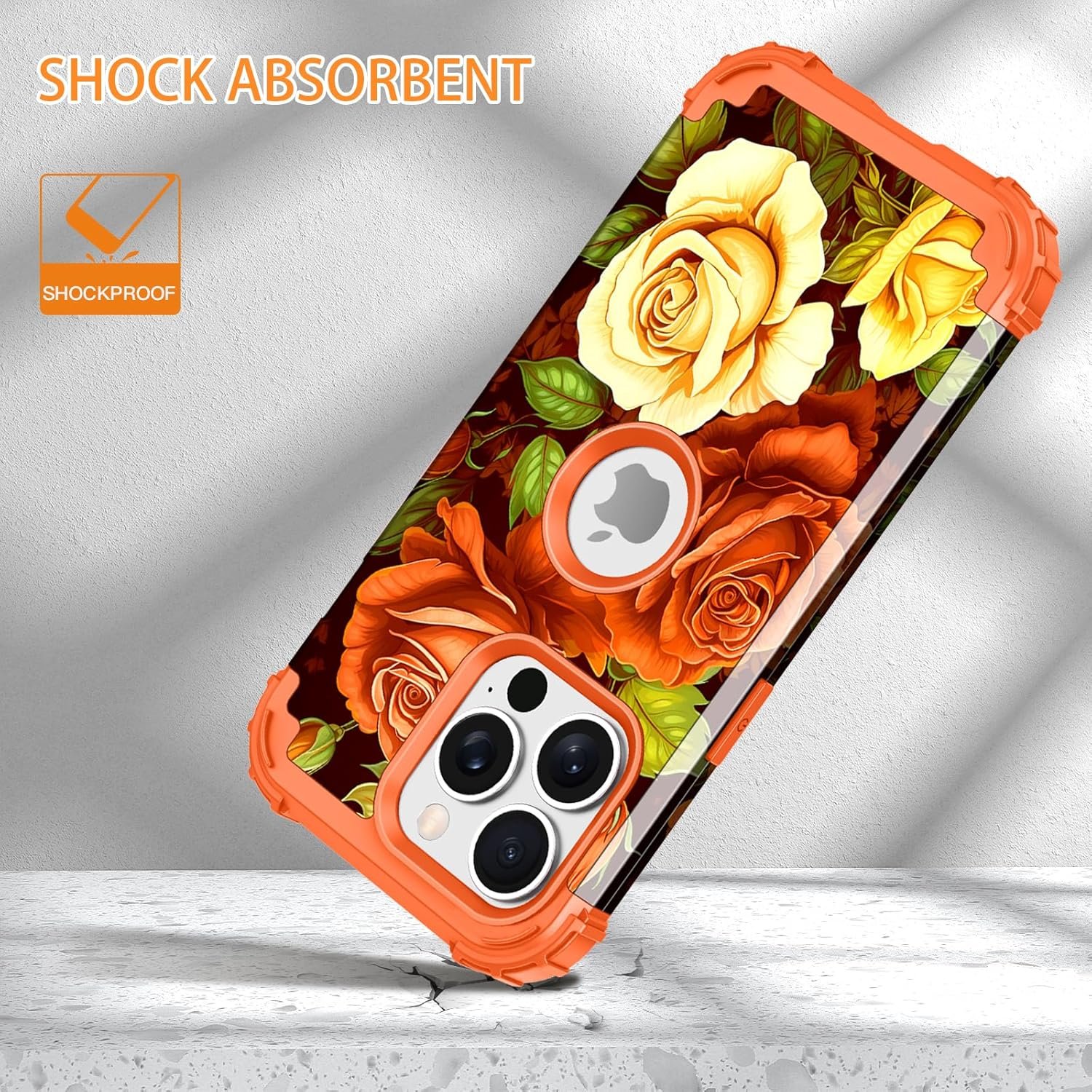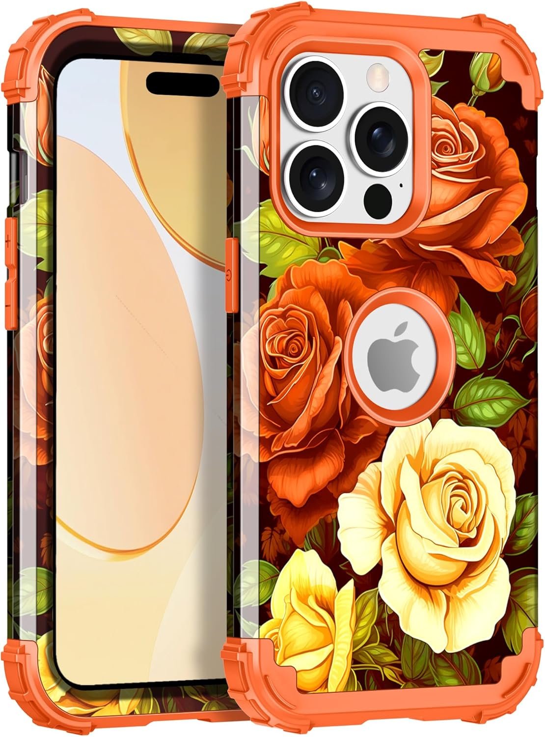 LONTECT for iPhone 15 Pro Max Case 3 in 1 Shockproof Heavy Duty Hybrid Sturdy High Impact Protective Cover Flower Case for Apple iPhone 15 Pro Max 6.7 inch 2023,Orange