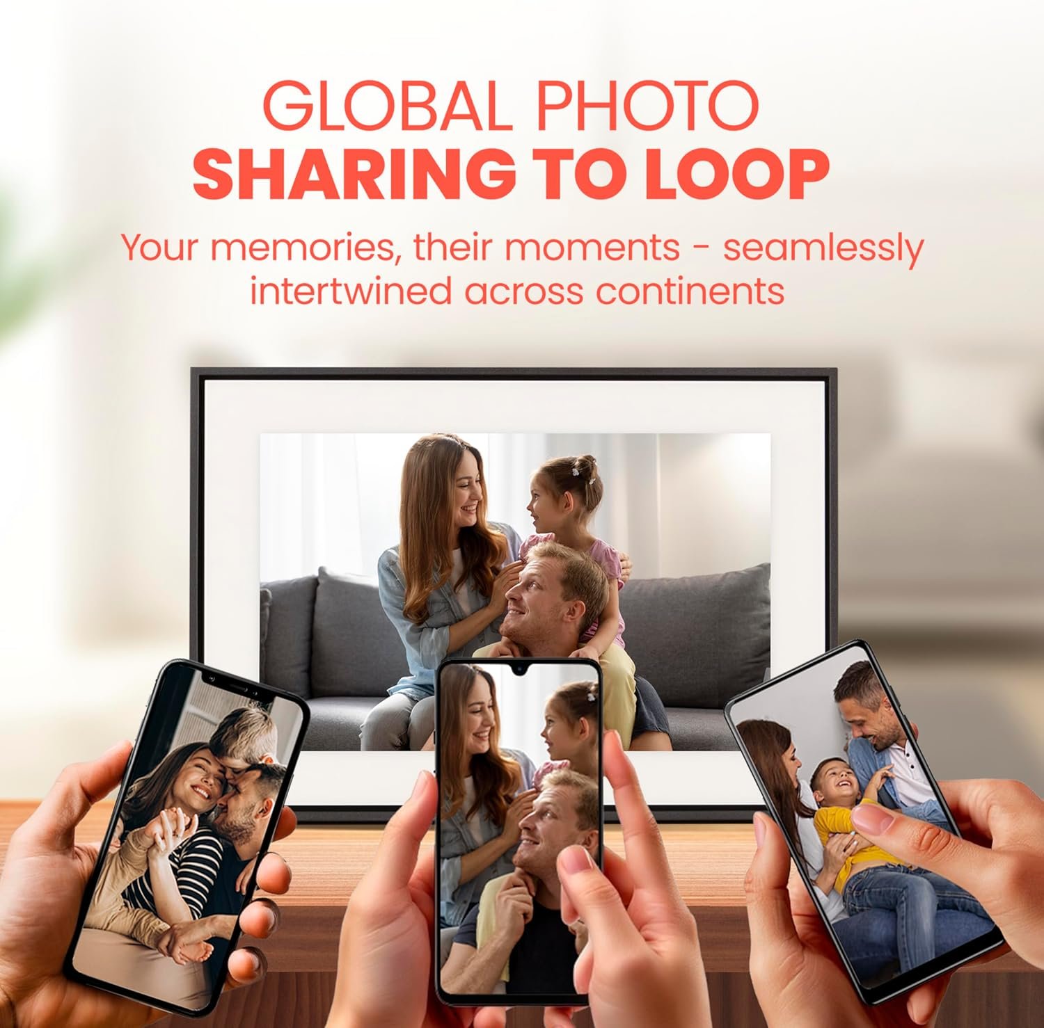 DIGITAL PHOTO FRAME: The Loop picture frame helps you easily display any picture in your home! Use our app or text photos to the Loop frame from anywhere, and your pictures will instantly appear in the frame for all to enjoy.