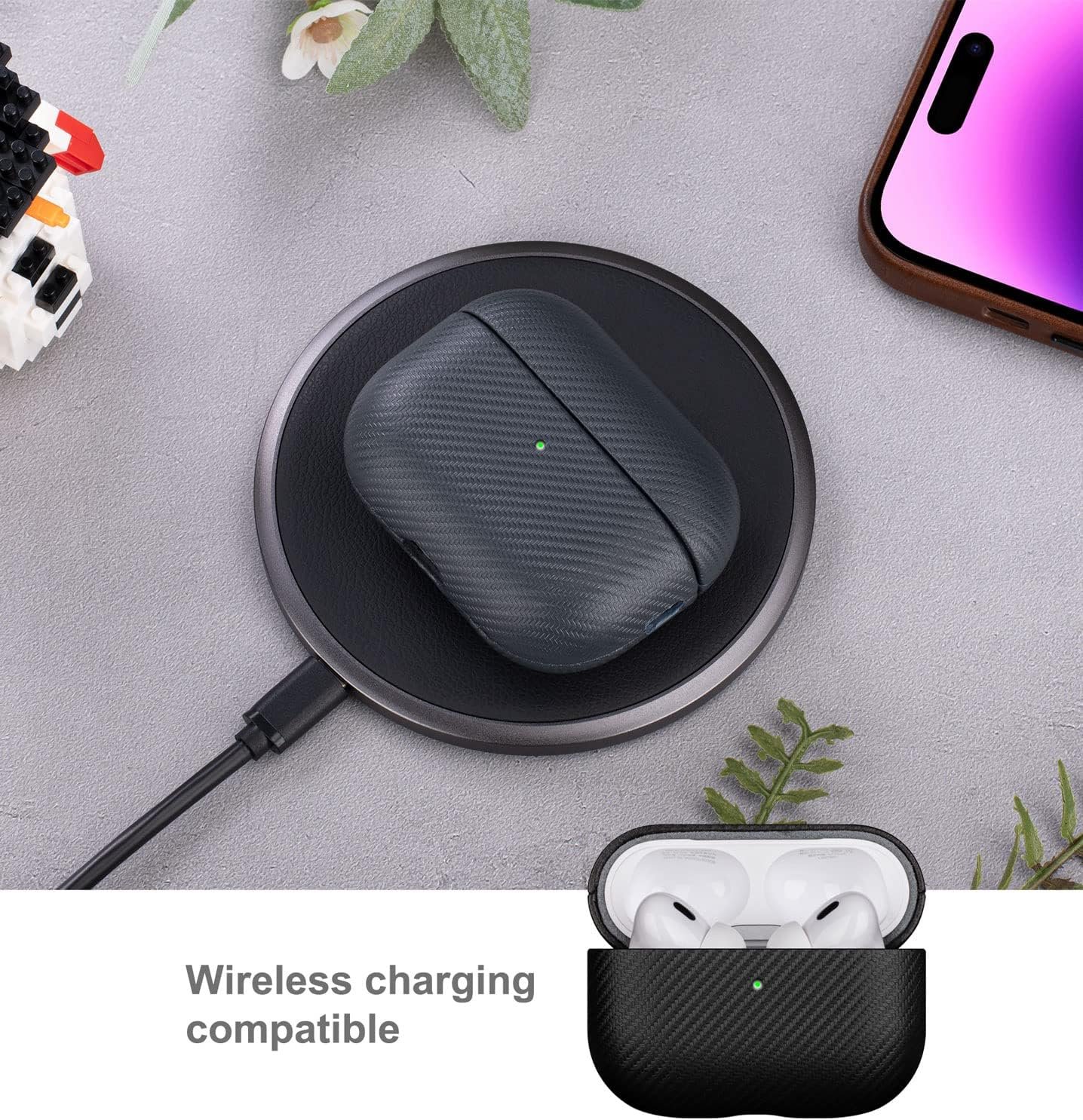 Carbon Fiber PatternFront LED Visible.Charge wirelessly in-case. Bottom cut-out for convenient wired charging. Soft and anti-skid microfiber lining on the interior of this airpods cases. Sleek and thin, but still reliably protective.