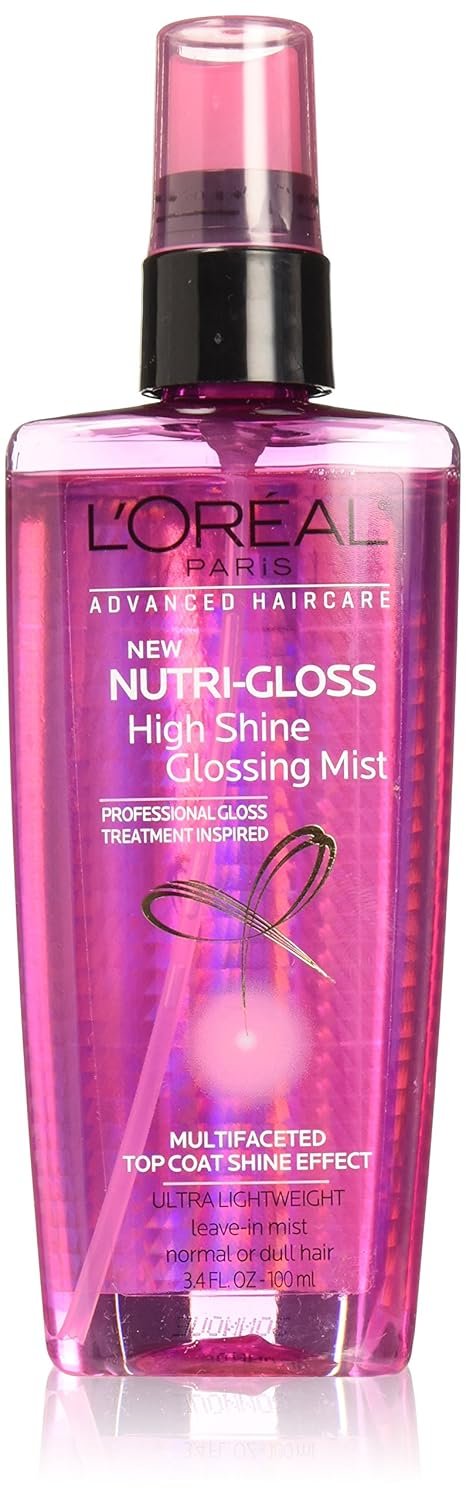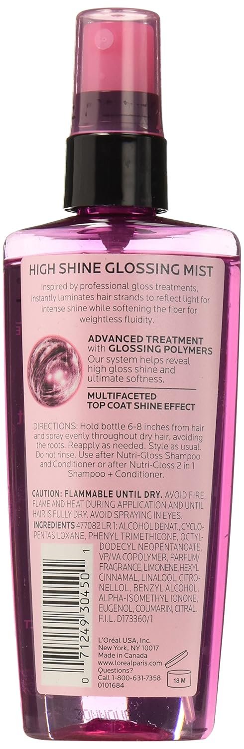 L’Oral Paris Nutri-Gloss High Shine Glossing Mist provides the ultimate boost for dull hair. It works by polishing hair for a glossy, shiny finish. Spray, tousle, and shine on. Up to 48 hours glossy shine + nutrition.* • For normal or dull hair • 48HR glossy shine plus nutrition • Multi-faceted top coat shine effect • Laminates strands for glossy shine *Based on using the system of shampoo, conditioner, and detangler mist. Packaging may vary, what you receive may not be what is reflected on site. Hold bottle 6-8 inches from hair and spray evenly throughout dry hair, avoiding the roots. Reapply as needed. Style as usual. Do not rinse. Use after Nutri-Gloss Shampoo and Conditioner or after Nutri-Gloss 2 in 1 Shampoo + Conditioner.