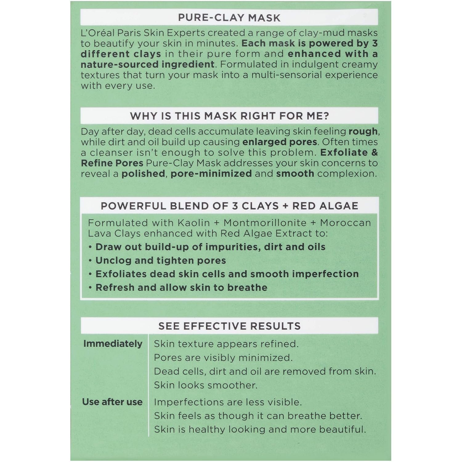 Indulgent. Transformative. Perfectly Clean. L’Oral Paris Skin Experts have created a super-charged pure clay mask enhanced with Red Algae Extract to exfoliate and refine your skin in just 10 minutes. Our unique and efficacious formula provides a multi-sensorial, fragrant experience while potent pure clays and volcanic rock exfoliate dead skin cells and smooth surface imperfections. Exfoliate & Refines Pores Pure-Clay Mask addresses rough and clogged skin to reveal a polished, pore-minimized and smooth complexion. Immediately skin texture appears refined and smooth. Pores are visibly minimized. Dead cells, dirt and oil are removed from skin. Use after imperfections are less visible. Skin feels as though it can breathe better. Skin is healthy looking with a beautiful glow. * Suitable for All Skin Types. • 3 Pure Clays and Red Algae • Exfoliates Dead Skin Cells • Unclogs and Tightens Pores • Reduces Surface Flaws Suitable for All Skin Types. HOW TO USE: Apply an even layer to clean dry skin, avoiding eye and lip area. Leave on for 10 to 15 minutes then remove with water in circular motions to exfoliate. For best results use 3 times a week. Suitable for All Skin Types