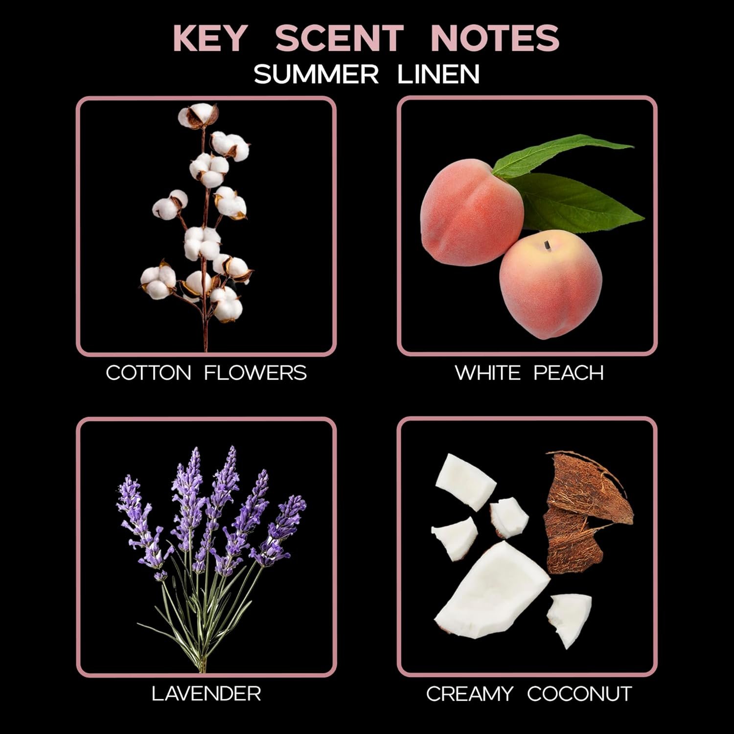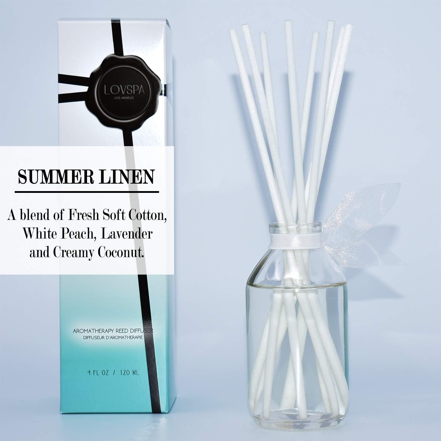 ⭐ LOVSPA Fragrances Summer Linen Room Diffuser is a blend of Fresh Soft Cotton, White Peach, Clean Lavender and Creamy Coconut.