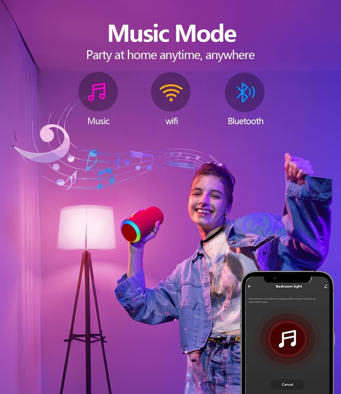Music Sync: Our wifi light bulbs change color and brightness simultaneously when sounds are detected by the microphone on your phone. Note: only works when the microphone is not occupied. Download Surplife App and enable microphone permissions.