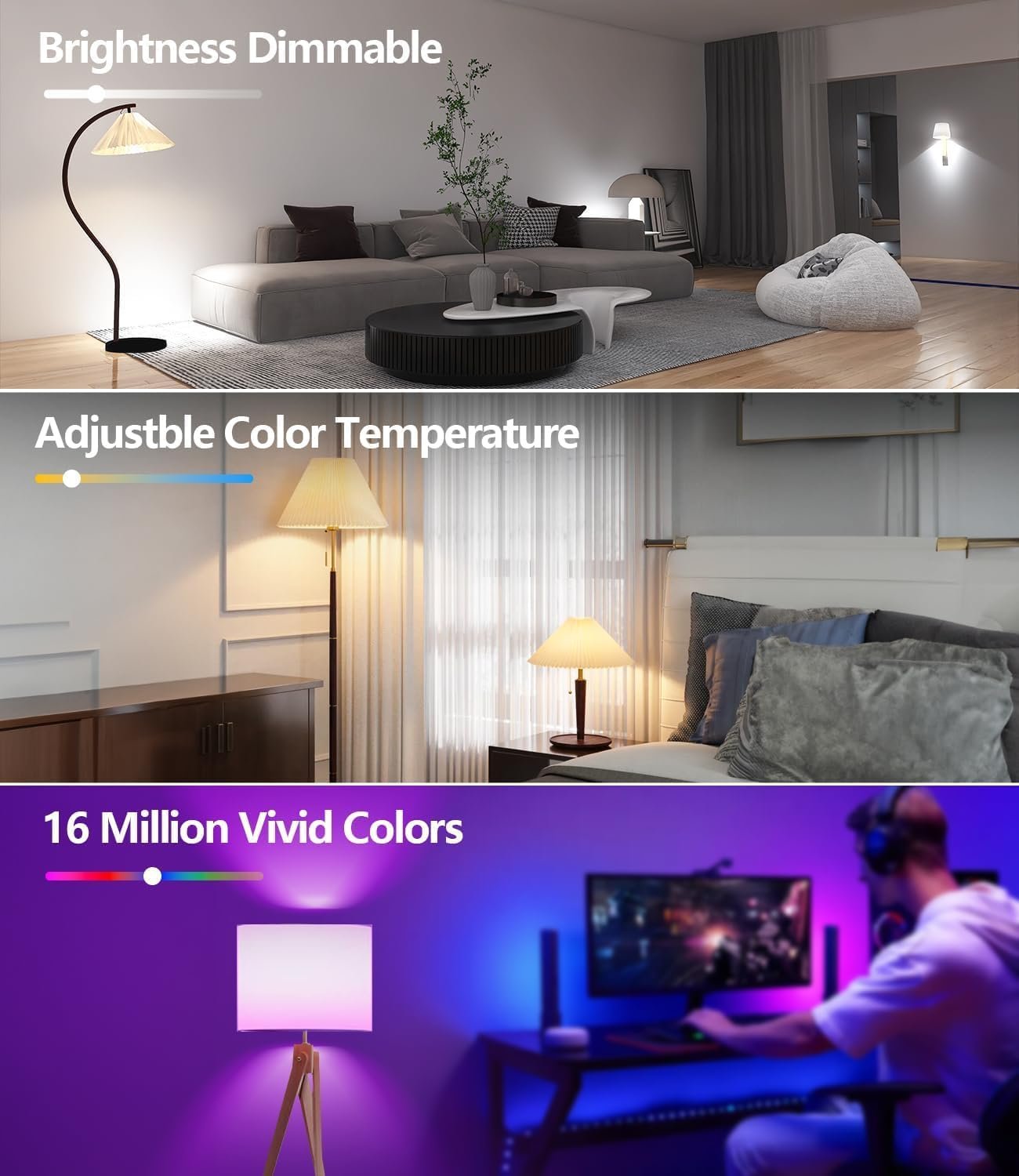 DIY Multicolor and Dimmable Lights: RGB bulbs offer 16 million dimmable colors and warm-to-cool whites (2700K-6500K) and multi-dynamic scenes, that change your mood. Create your favorite lighting effects and adjust the brightness as needed. Ideal for decorating your home during holidays like Halloween, Christmas, and Thanksgiving, etc.