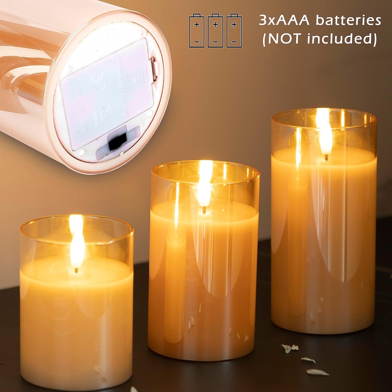 🕯【Battery Operated Candles】Each LED glass candle requires 3xAAA batteries (not included), which is energy saving and low consumption. Different from normal candles, these LED candles can save cost and is more eviromental friendly! Better than real candles, these flameless pillar candles are long-lasting and reusable, you buy them once, you have them forever!