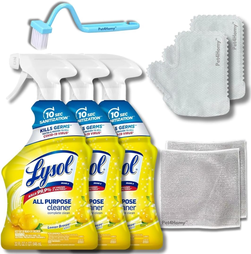 Bundle of 4 Items: This bundle includes All-Purpose Cleaner Sanitizing and Disinfecting Spray (Lemon Breeze Scent, 32oz 3-Pack) along with Pet4Homy Cleaning Gloves, Cleaning Brush, and Multipurpose Wire Miracle Cleaning Cloths.