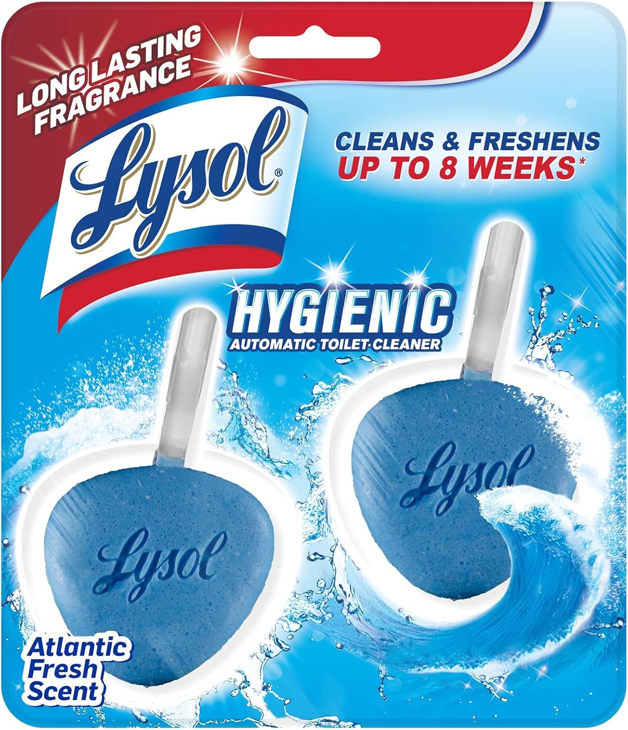 Lysol Hygienic Automatic Toilet Bowl Cleaner hangs on the inside of the toilet bowl to help you maintain a Complete Clean between deep cleaning your toilet bowl. It not only cleans your toilet bowl with every flush, but it also freshens your entire bathroom . They last for up to 8 weeks, and are easy to use! It contains protection in the hook to resist odor causing bacteria.