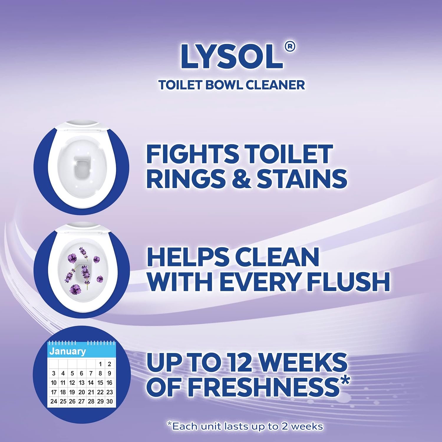 Lysol brand new day automatic toilet bowl Cleaner, helps clean and freshen your toilet automatically with every flush. It hangs on the inside of the toilet bowl to help you maintain your toilet between deep cleaning your toilet bowl. It Not only cleans your toilet bowl with every flush, but it also freshens your entire bathroom. They last for up to 8 weeks, and are easy to use.