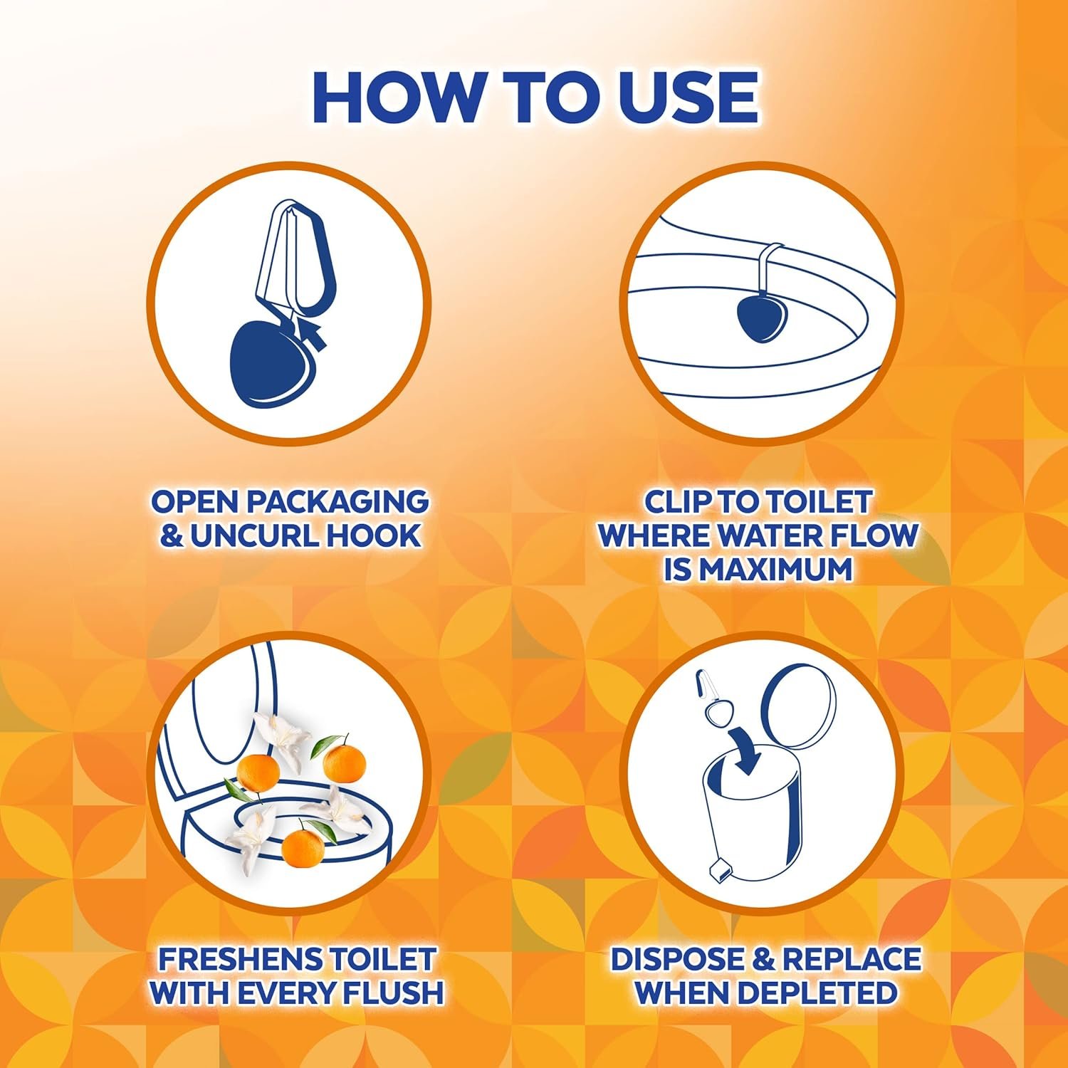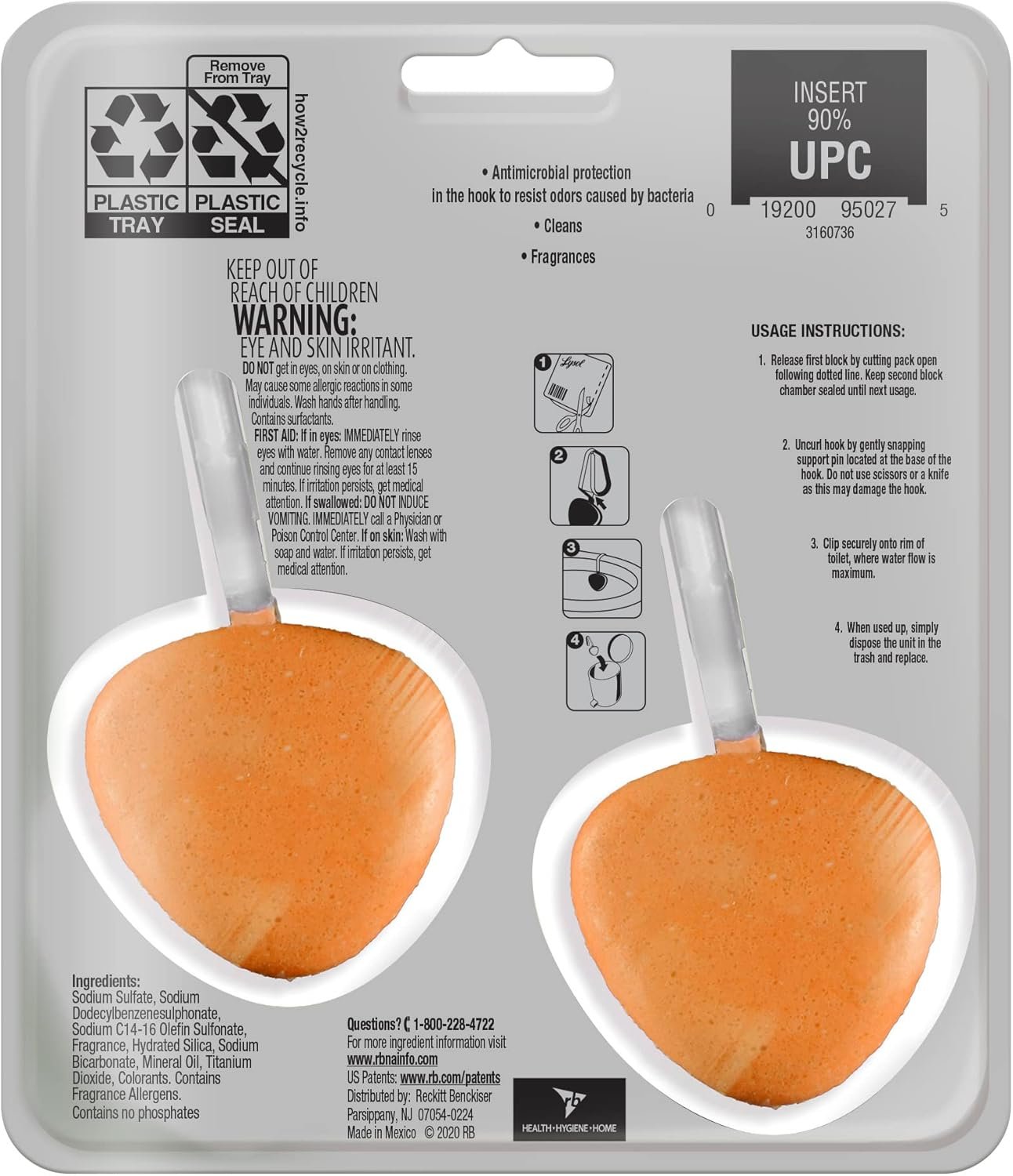 Lysol Hygienic Automatic Toilet Bowl Cleaner hangs on the inside of the toilet bowl to help you maintain a Complete Clean between deep cleaning your toilet bowl. It not only cleans your toilet bowl with every flush, but it also freshens your entire bathroom . They last for up to 8 weeks, and are easy to use! It contains antimicrobial protection in the hook to resist odor causing bacteria.