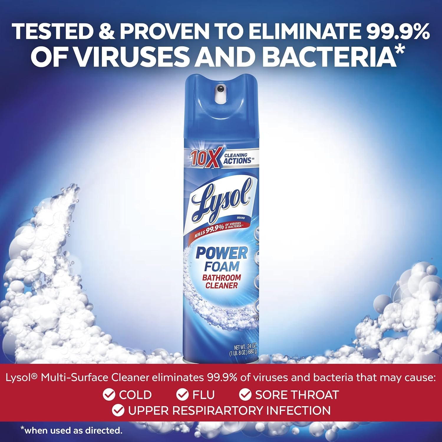 Lysol Power Bathroom Cleaner eliminates soap scum, lime scale, and other tough messes. Clean bathroom surfaces to a brilliant shine with Lysol Power Bathroom Cleaner. The powerful foaming action tackles even the toughest cleaning challenges – removing soap scum, lime scale, and everyday dirt and grime – with little or no scrubbing. It leaves behind a clean, fresh scent.Disinfects & kills 99.9% of bathroom viruses & bacteriaPrevents the growth of mold and mildewPowers through soap scum & Lime scaleCleans everyday dirt & grimeProvides long lasting freshness. Ingredients Octyl Decyl Dimethyl Ammonium Chloride, Dioctyl Dimethyl Ammonium Chloride, Didecyl Dimethyl Ammonium Chloride. Instructions Shake well before using. Point button to mark on rim. Hold can 6-8 inches from surface to be cleaned and spray the entire surface. Press button and cover area lightly with white foam. After a few seconds, wipe off with a clean cloth or sponge. For heavily soiled surfaces allow foam to remain longer on surface before wiping.
