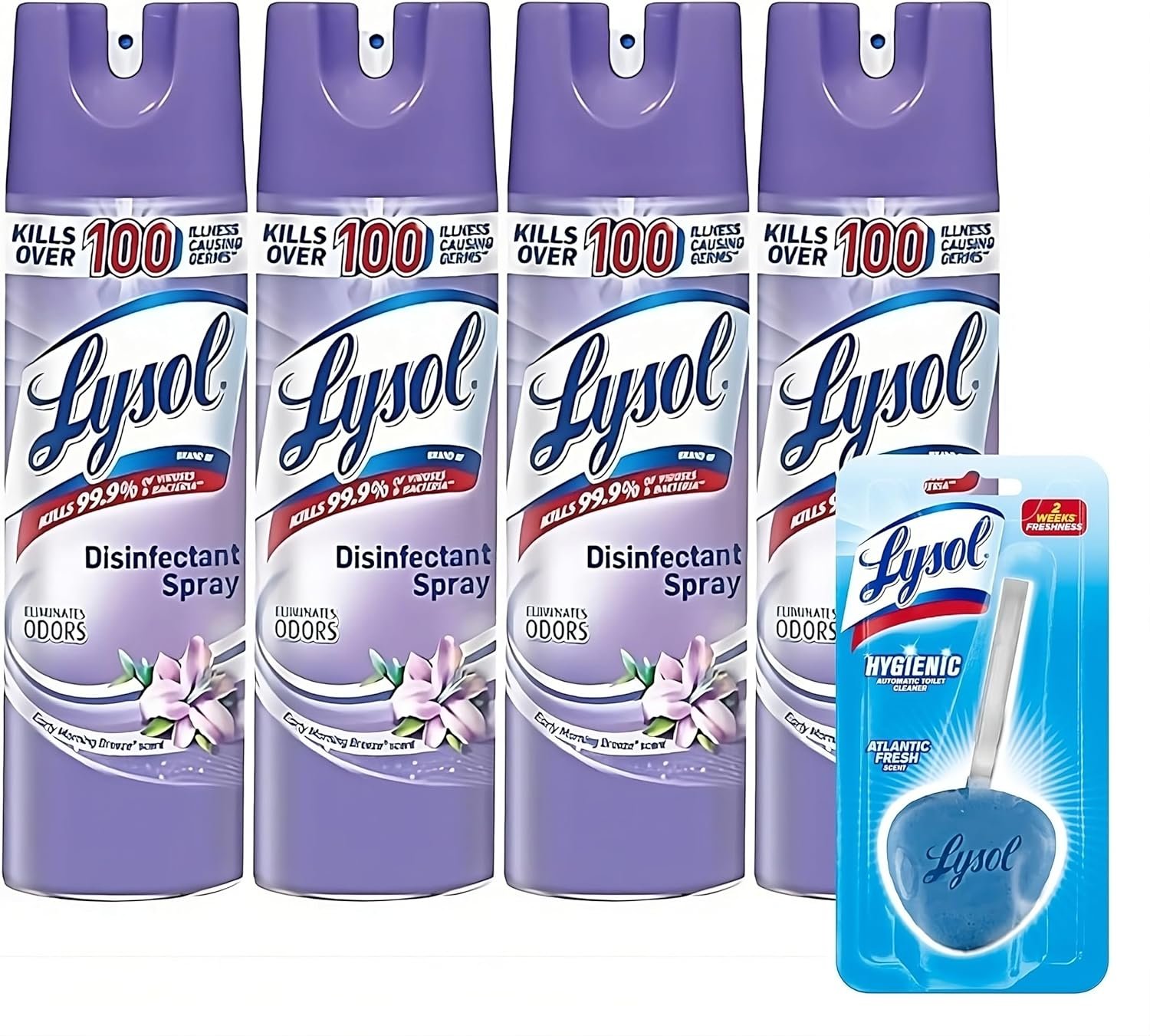 Lysol Disinfectant Spray, Early Morning Breeze, 19 Oz (Pack of 4) -With 1ct Auto In-The-Bowl Toilet Cleaner, Atlantic Fresh