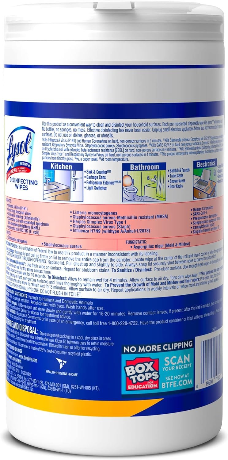 Lysol Disinfecting Wipes can be used as a convenient way to clean and disinfect your household surfaces. Each pre-moistened disposable disinfecting wipe kills 99.9% of germs when used as directed. No bottles, no sponges, no mess. Lysol Disinfecting Wipes are great for cleaning most surfaces and disinfecting surfaces. These Lysol Wipes kills 99.99% of all viruses and bacteria, including the following: Cold and Flu Viruses, Salmonella Enterica (Salmonella), Influenza A Virus, Herpes Simplex Virus Type 1, Respiratory Syncytial Virus, and COVID-19 when used as directed on hard, non porous surfaces. Each cleaning disinfecting wipe kills cold and flu viruses and helps stop the spread of germs, perfect for touch-up cleaning. Lysol Wipes are also approved to remove more than 95% of allergens. Like germs, allergens exist on hard surfaces. Use Lysol wipes as directed. These disinfecting wipes are even suitable to use on wood. How to Use Lysol Disinfecting Wipes? Pre-clean surface. Use enough fresh disinfectant wipe to thoroughly wet the surface. To Sanitize with these cleaning wipes: Allow to remain wet for 10 seconds. To disinfect with these cleaning wipes: Allow to wet for 4 minutes. To clean and remove allergens with these cleaning wipes: Use fresh wipe on surface. For surfaces that come in contact with food, rinse thoroughly with water. Repeat for stubborn stains. For more than a century, Lysol has been helping to protect families from illness-causing germs. To learn more about our mission and find further disinfecting solutions, solutions for household cleaning, and disinfectant spray products, visit our website or check out our instagram. ​.