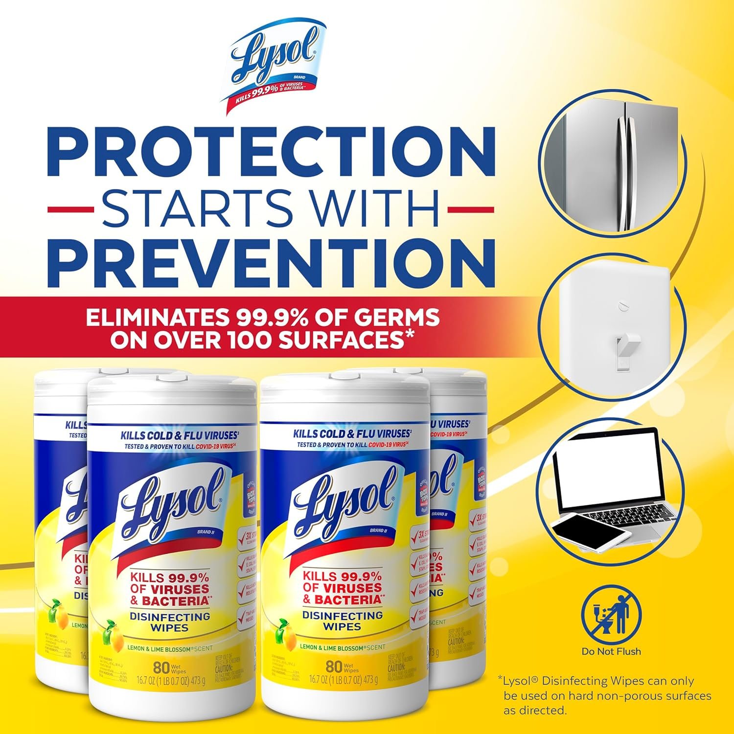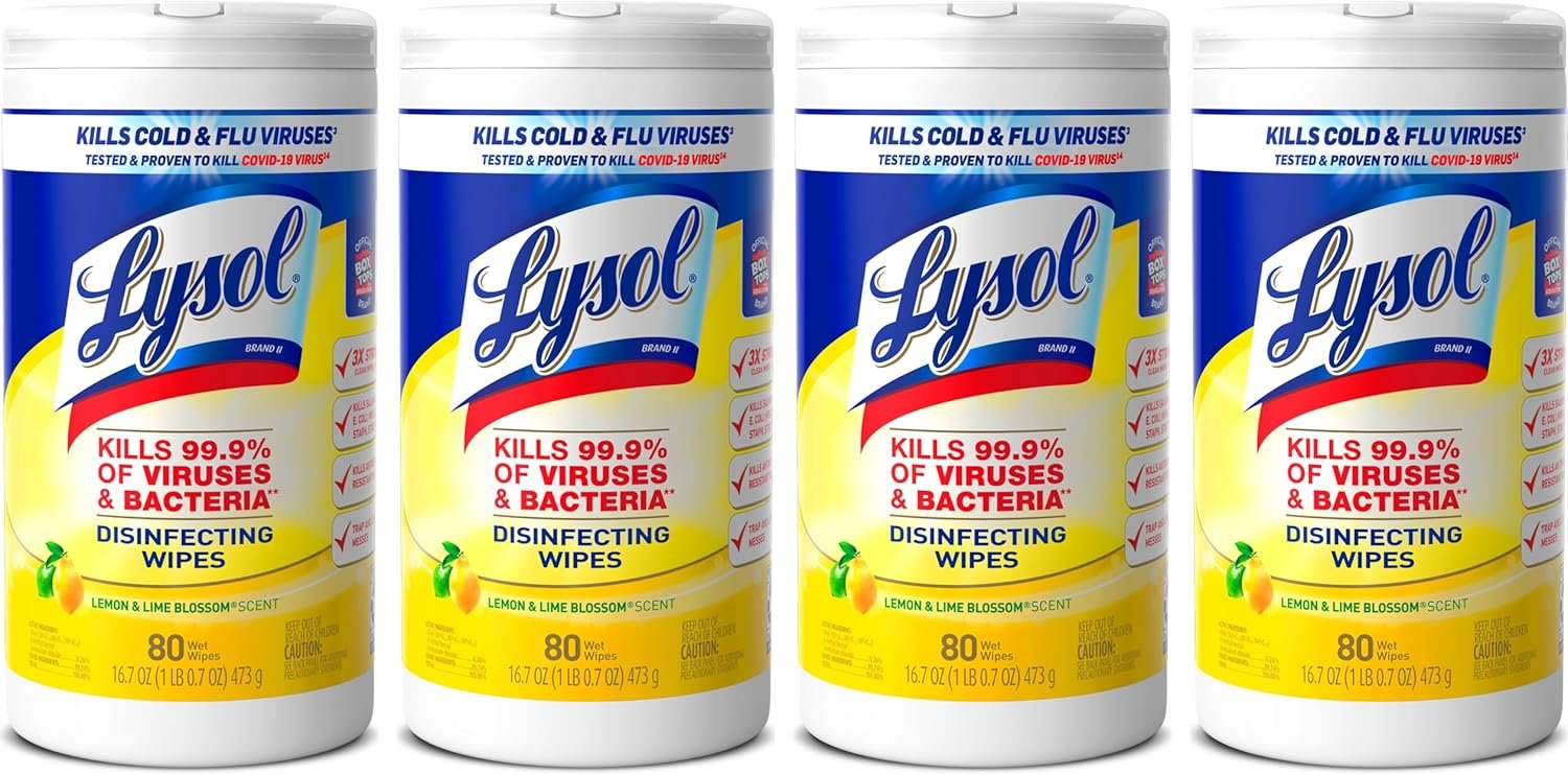 Lysol Disinfectant Wipes, Multi-Surface Antibacterial Cleaning Wipes, For Disinfecting and Cleaning, Lemon and Lime Blossom, Pack of 4 (Packaging may vary)