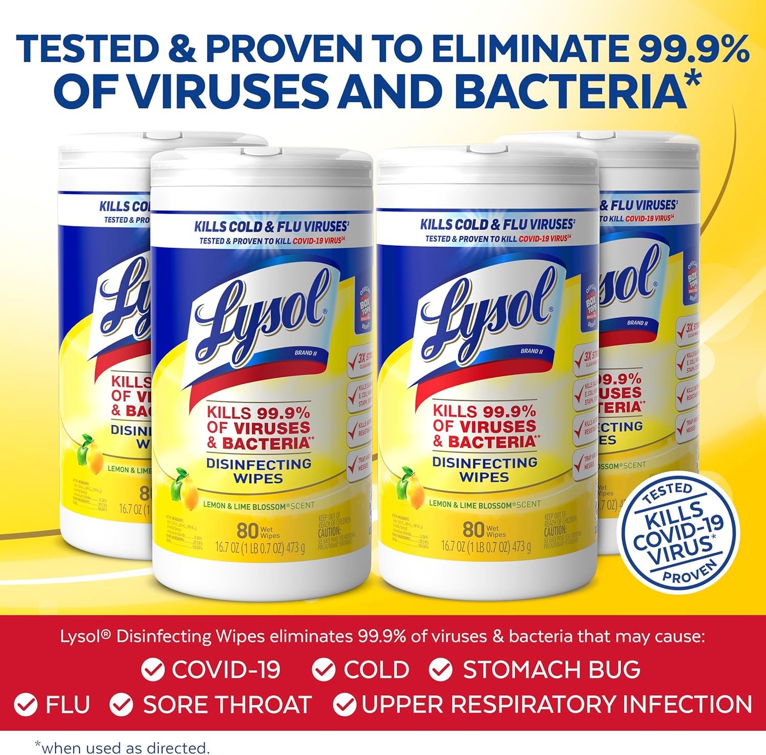 DISINFECTING WIPES FOR CLEANING: Disinfect and deodorize with the fresh smell of Lemon and Lime Blossom Lysol Disinfecting Wipes. Safely wipe down spills and remove allergens, including pet dander, dust mites, and pollen​.​