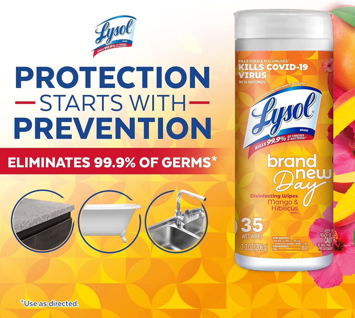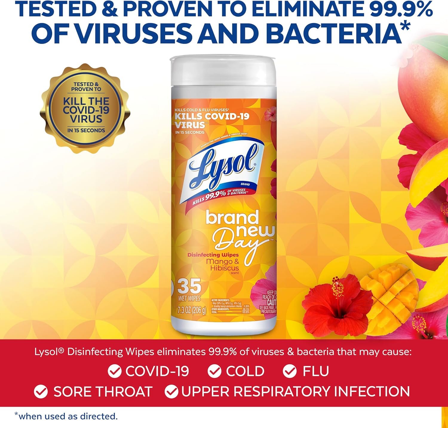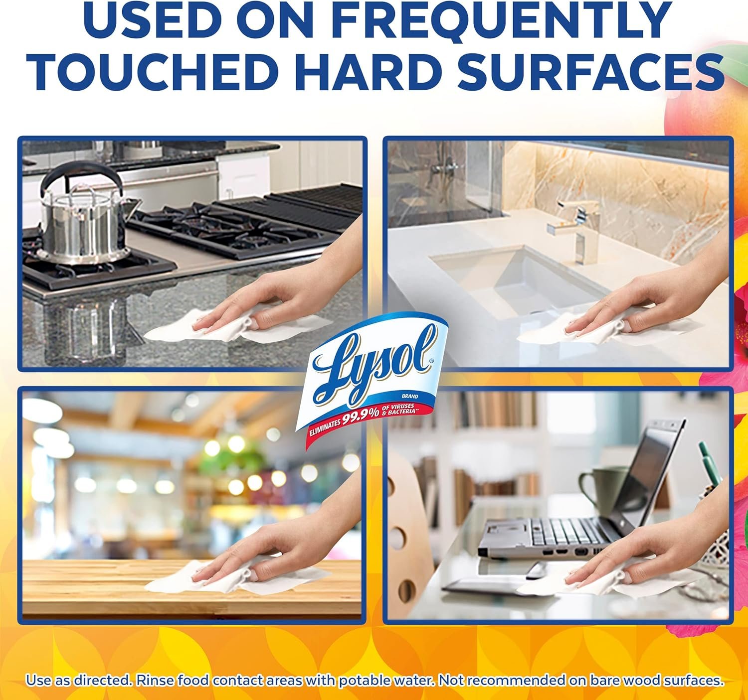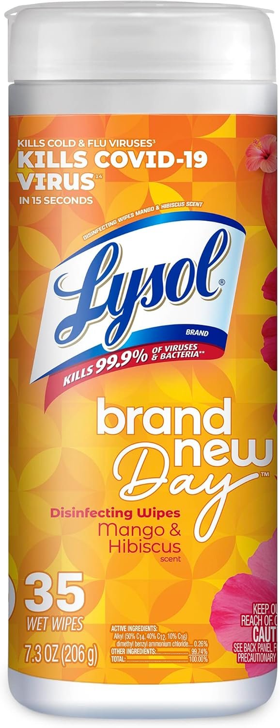 DISINFECTING WIPES FOR CLEANING: Disinfect and deodorize with the fresh smell of Mango & Hibiscus Lysol Disinfecting Wipes. Safely wipe down spills and remove allergens, including pet dander, dust mites, and pollen.