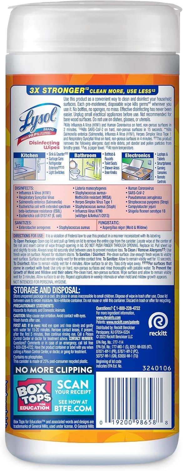 DISINFECTING WIPES KILLS 99.9% OF VIRUSES AND BACTERIA: Lysol Disinfecting Wipes are tested and proven to clean and kill 99.9% of viruses and bacteria, including 8 cold and flu viruses* (when used as directed).