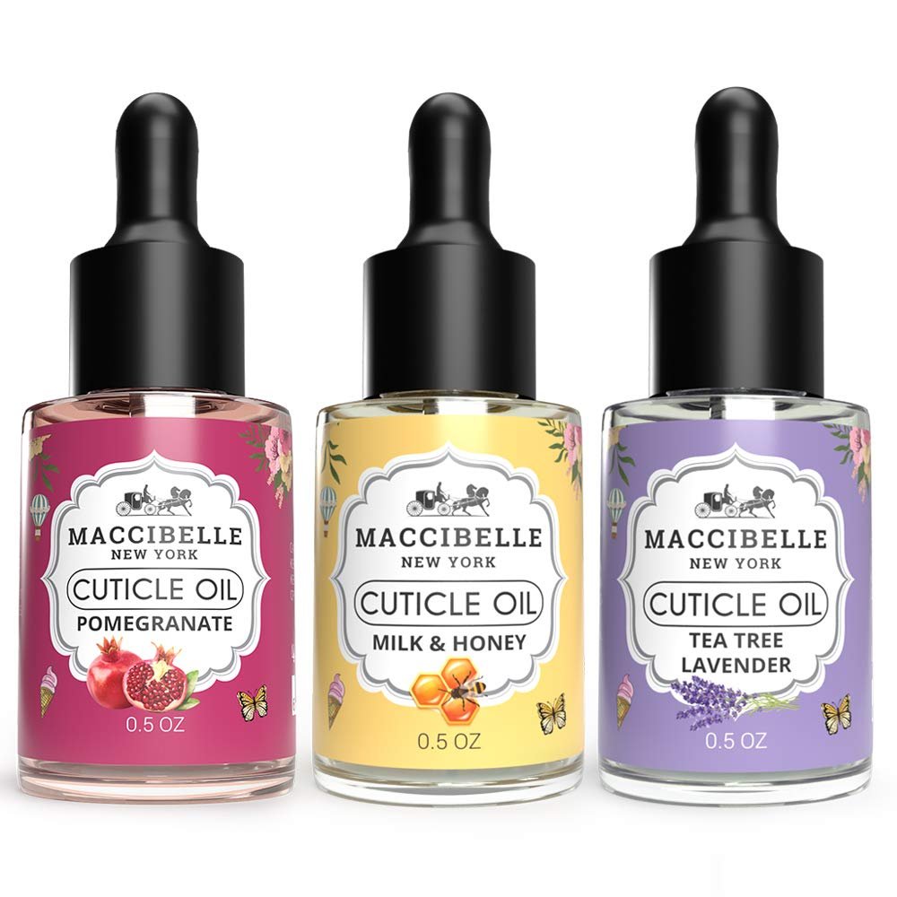 Contains: -1 Maccibelle Lavender cuticle oil bottle 0.5 oz -1 Maccibelle Honey cuticle oil bottle 0.5 oz -1 Maccibelle Pomegranate cuticle oil bottle 0.5 oz