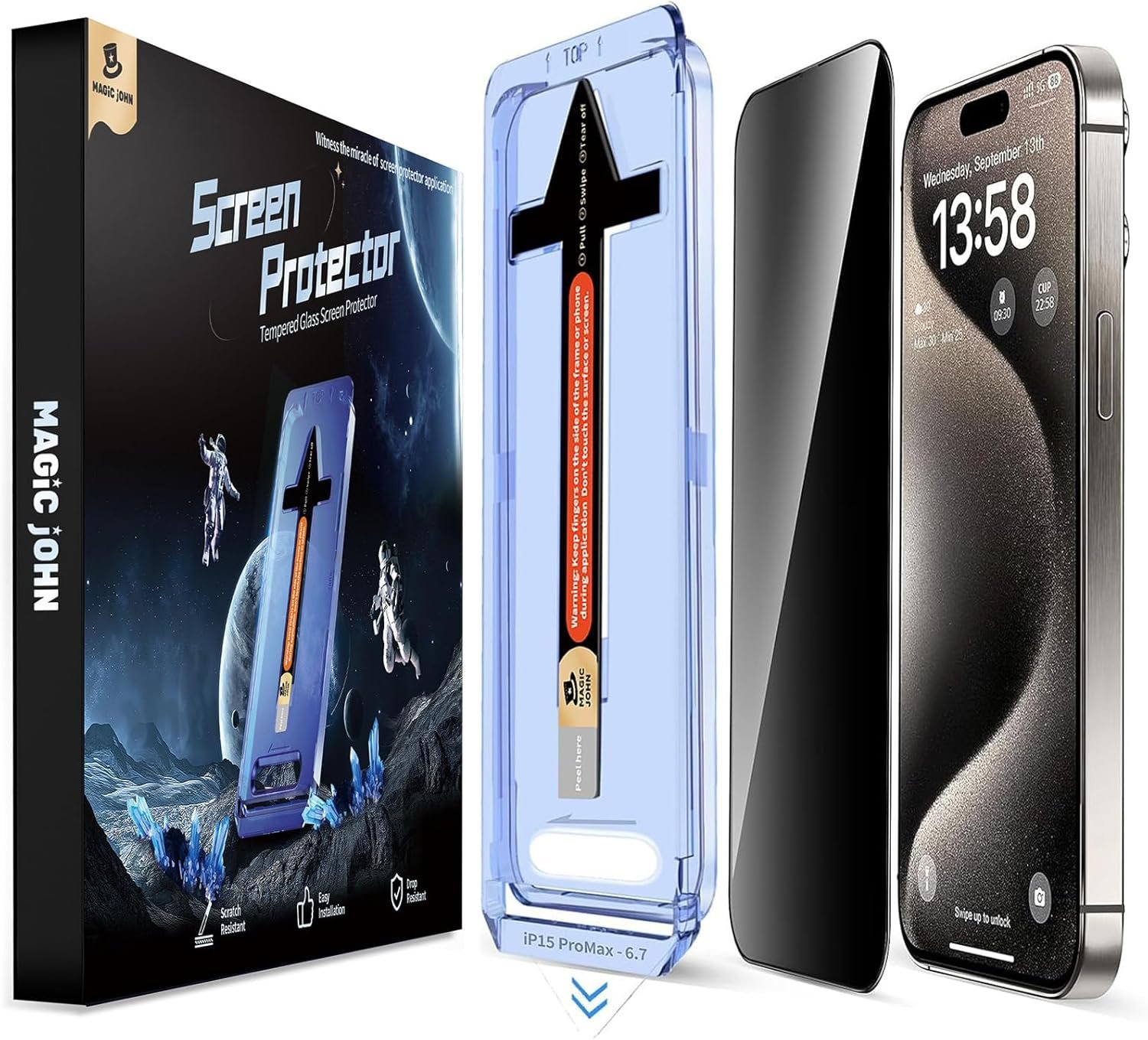 [Anti-Fingerprint] MAGIC JOHN privacy glass screen protector for iPhone 15 Pro Max 6.7 inch is finished with oleophobic coating to against oil residue from fingerprints from long-term use.