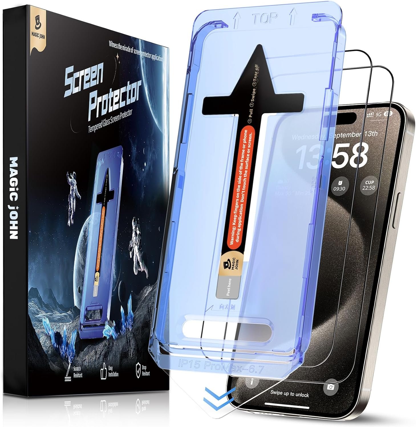 MAGIC JOHN 2 Pack for iPhone 15 Pro Max 6.7 inch Tempered Glass Screen Protector, Auto Dust-Elimination Installation, Bubble Free, Dynamic Island Compatible, HD Clear, Easy Installation
