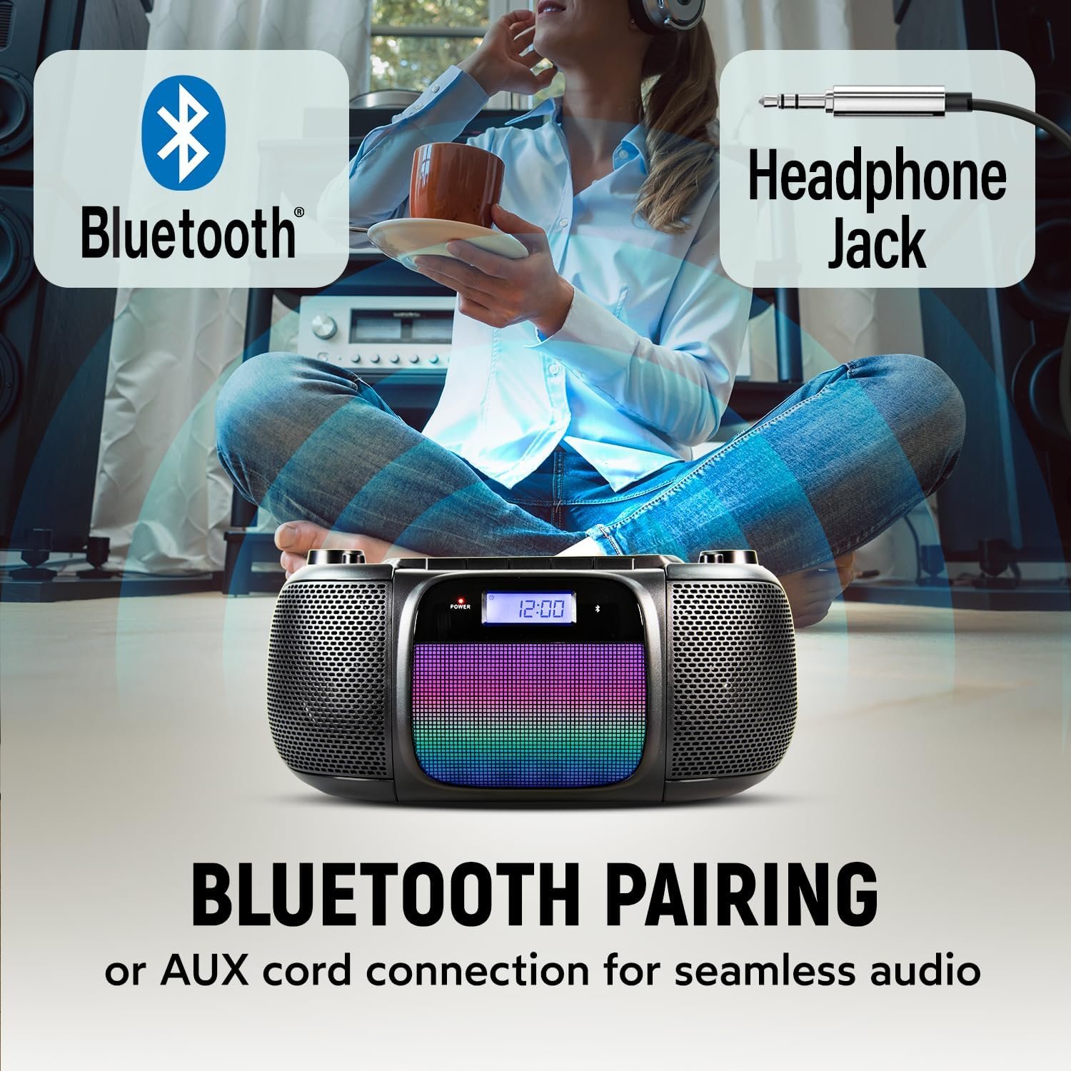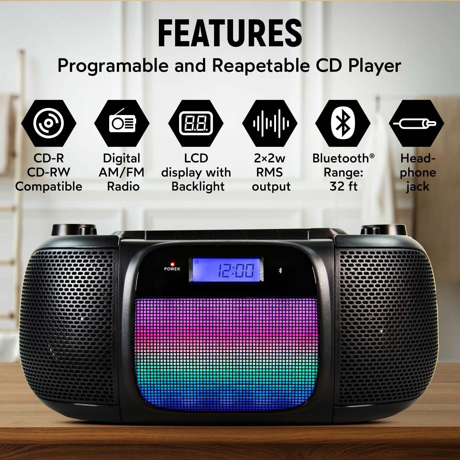 KEY FEATURES: Top loading CD-R/CD-RW player, total 2 x 2W RMS output, programmable CD player, digital PLL AM/FM stereo radio, color changing lights pulsate to the beat, LCD display with blue backlight, connects to any audio device via 3.5mm aux in port, headphone jack, Bluetooth wireless technology, and AC operation.