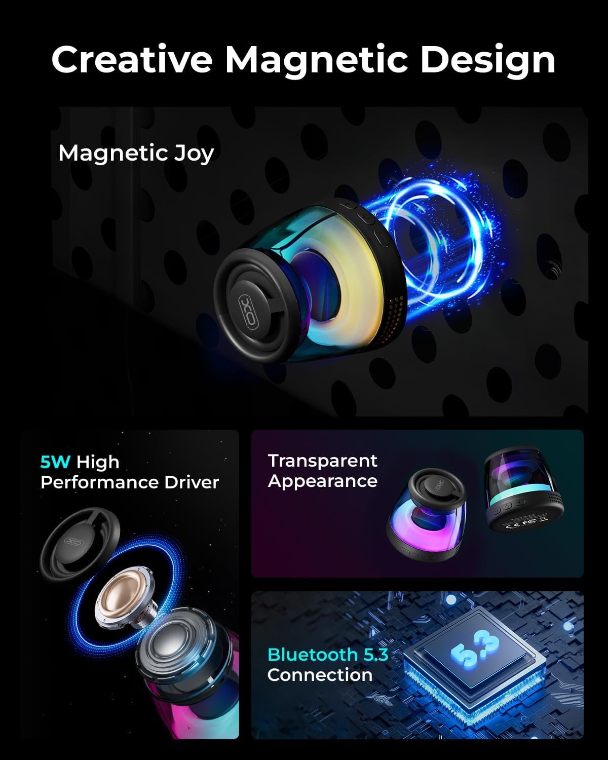đ”ăColorful RGB LightingăTo rich and enhance your audio experience, XO mini bluetooth speaker is built-in RGB lights, cool lighting syncs with music for an immersive audio-visual feast. Lighting effect will perform well in dingy place and night. Turning off or on the lights as your mind.