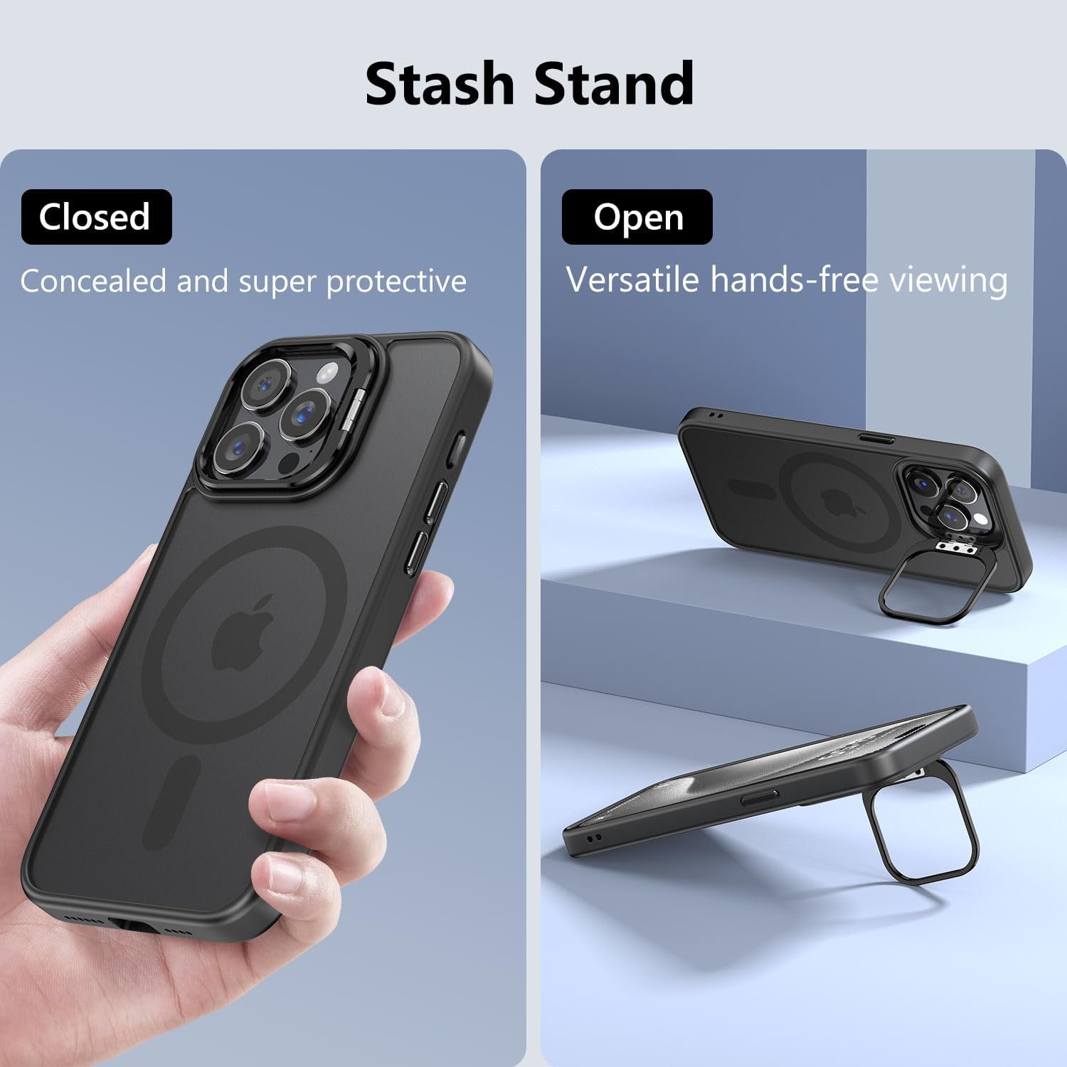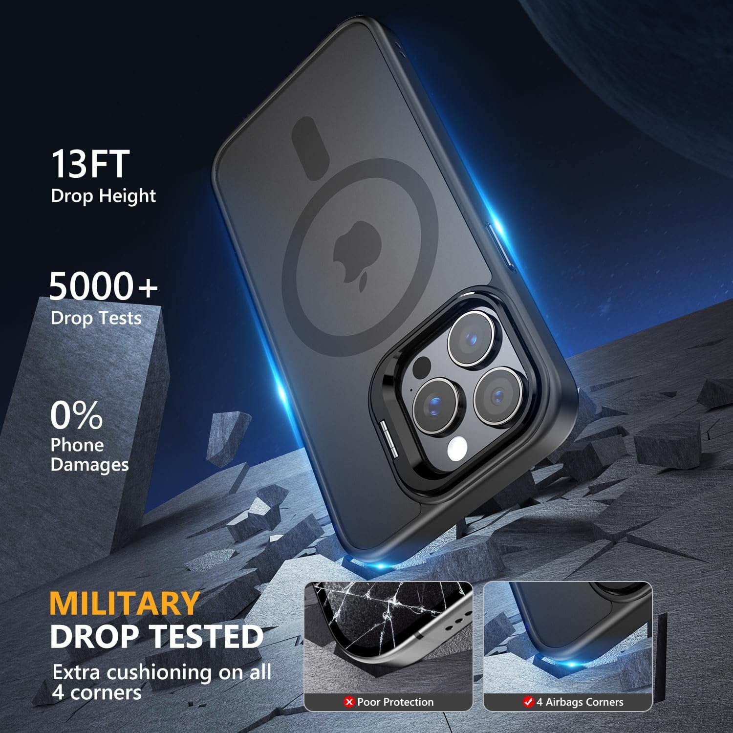 【Invisible Stand for Horizontal and Vertical】Titanium alloy metal sturdy kickstand is built at the camera. Adjustable from 0 to 150 degrees for both horizontal and vertical use, and will not interfere with the use of the magnetic function. The sturdy stand can also be used as a hand ring. When closed, the 3 mm raised lip reliably protects your camera from scratches.