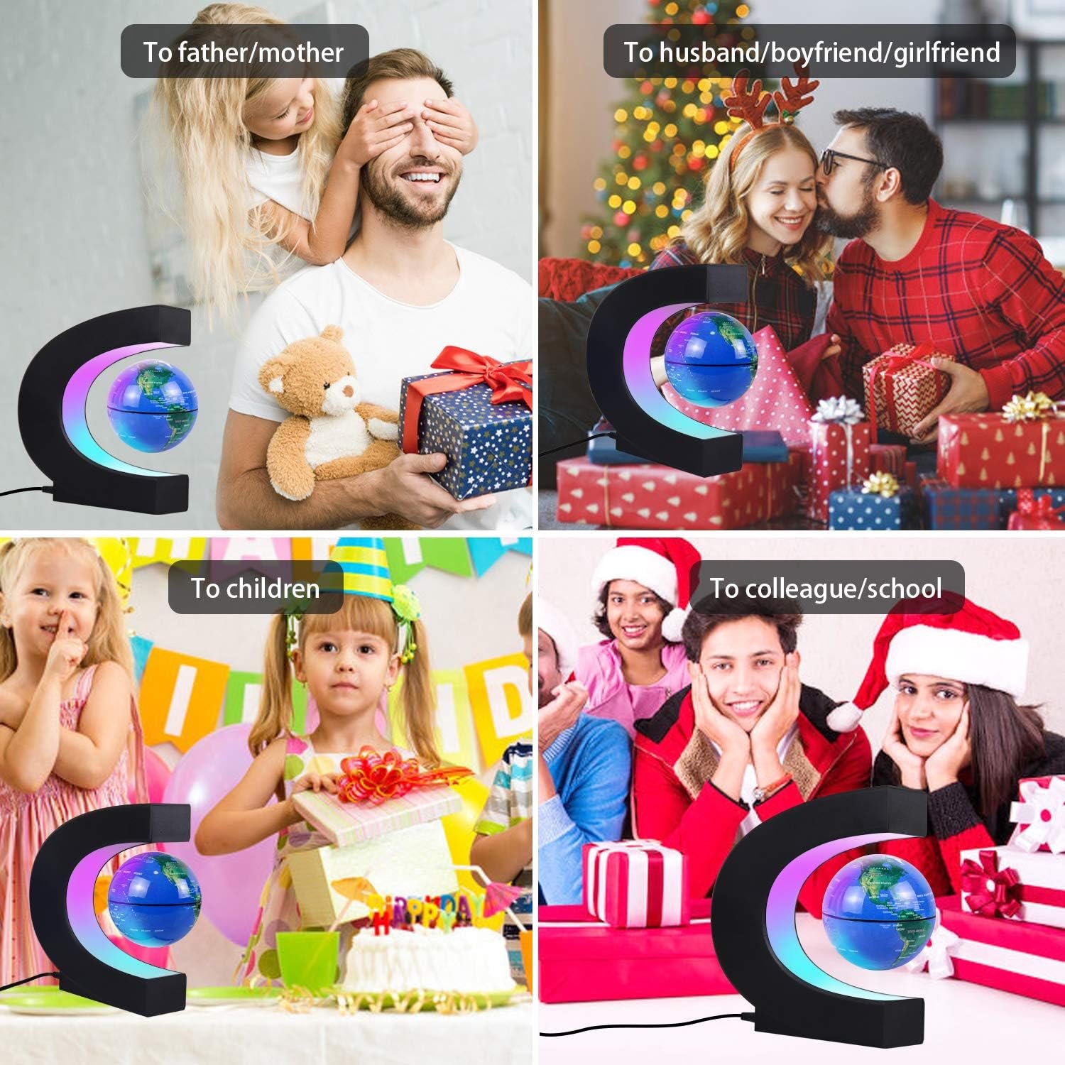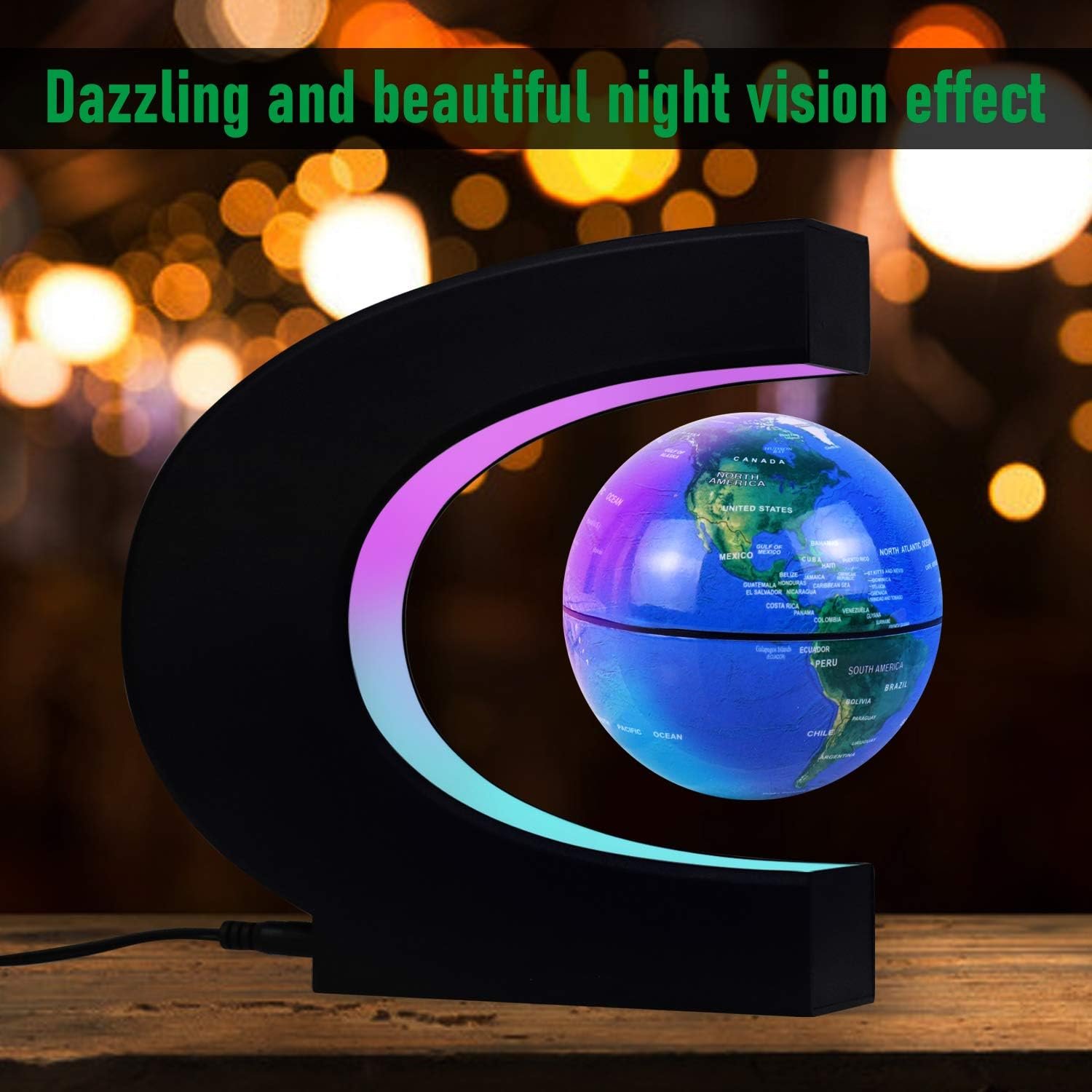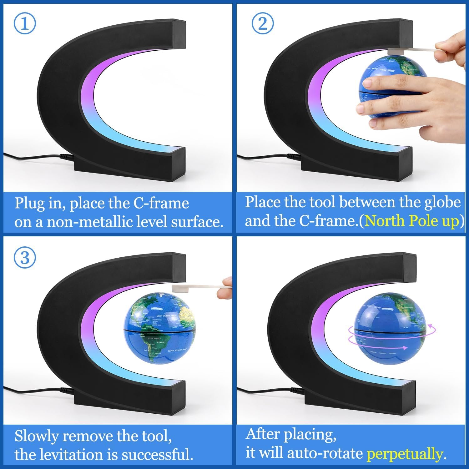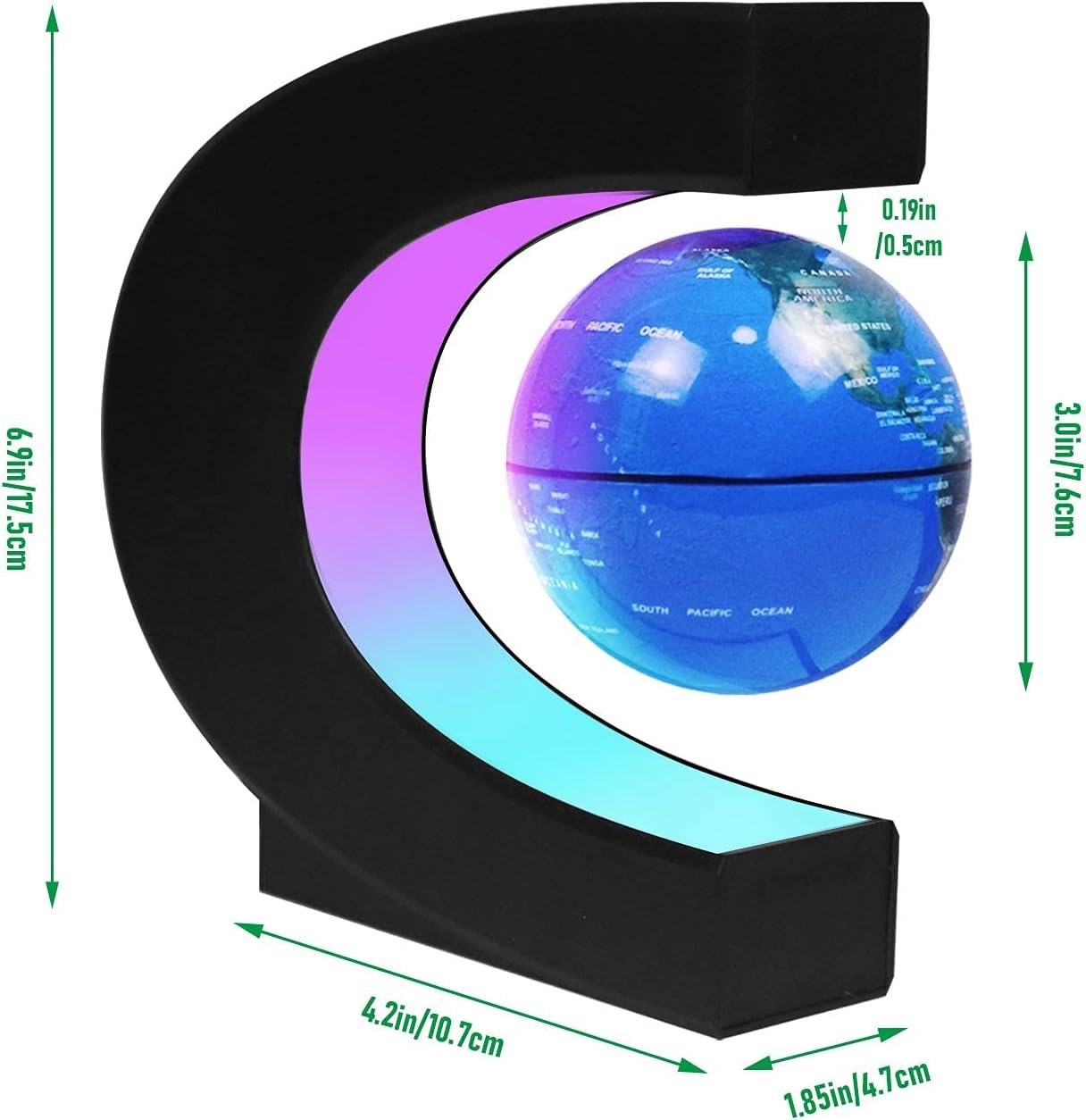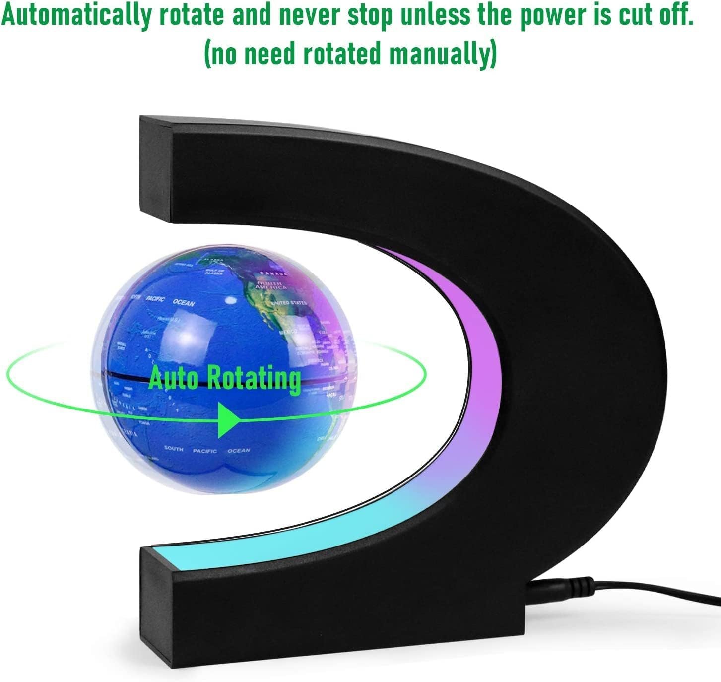 🌎【Multi-Color Lights】The C-shaped floating frame built-in a light strip with 9 LED lamp beads. Plug in and it lights up in 3 colors (Blue, Green, Red) which is a really cool gadget in the dark. The light will stay on as you plug in.