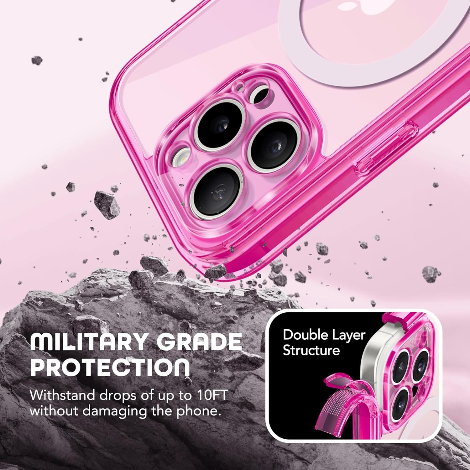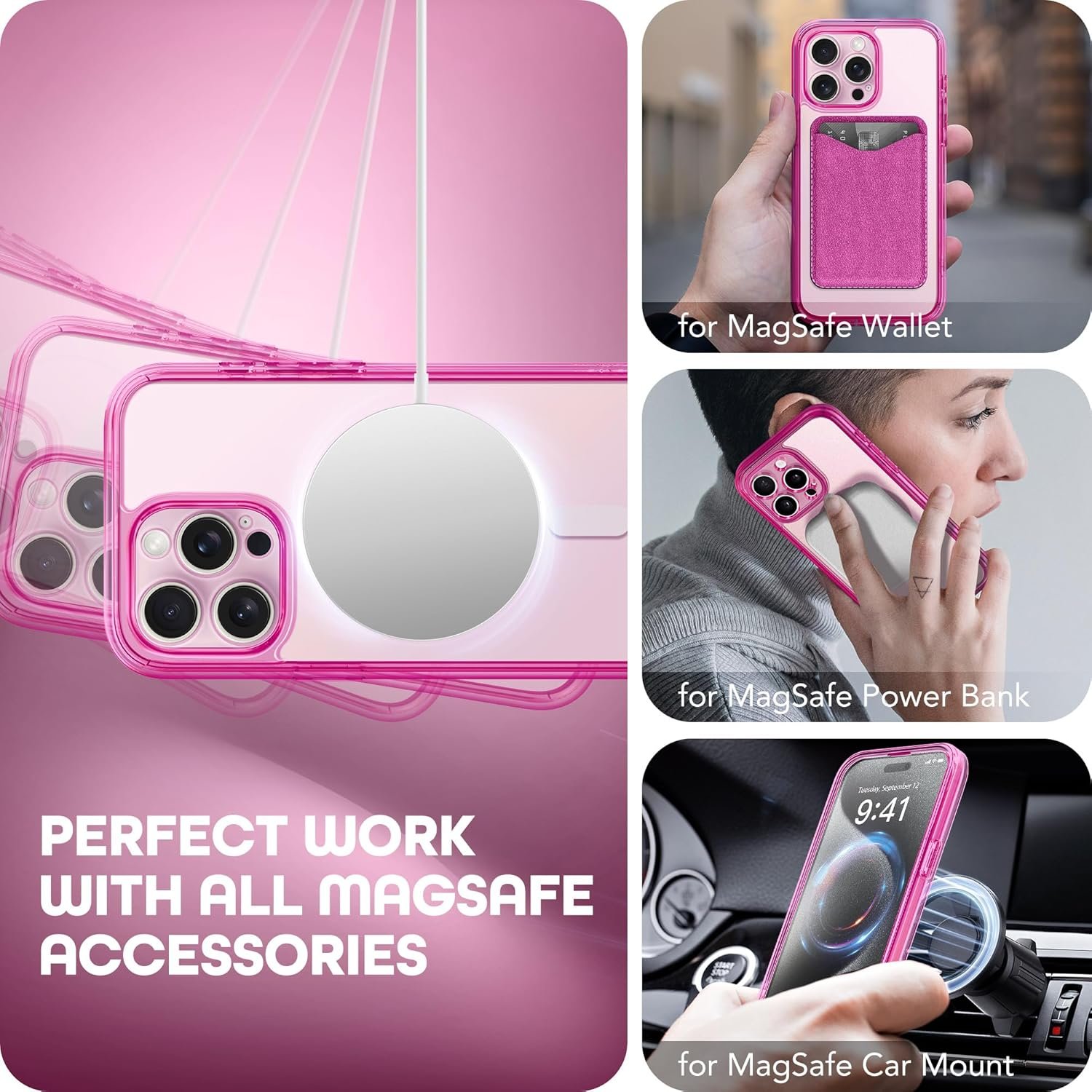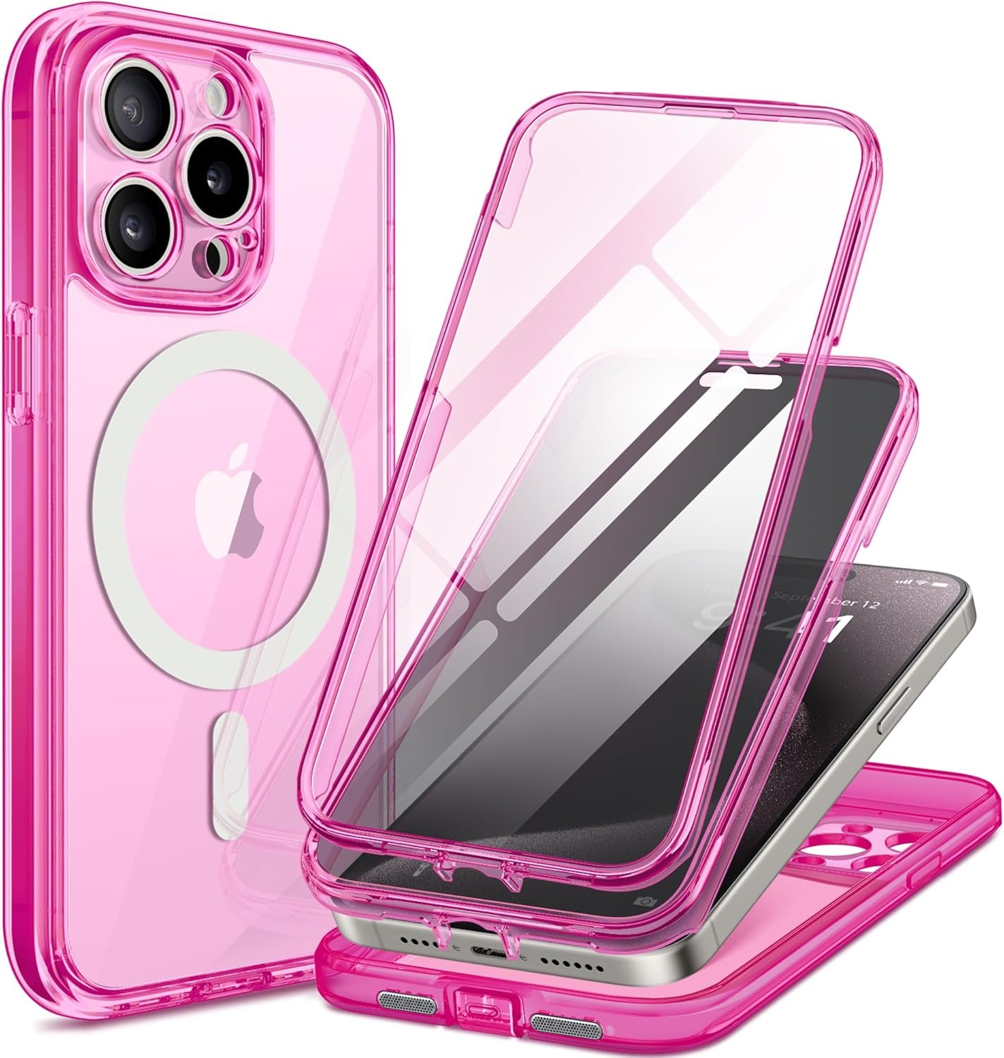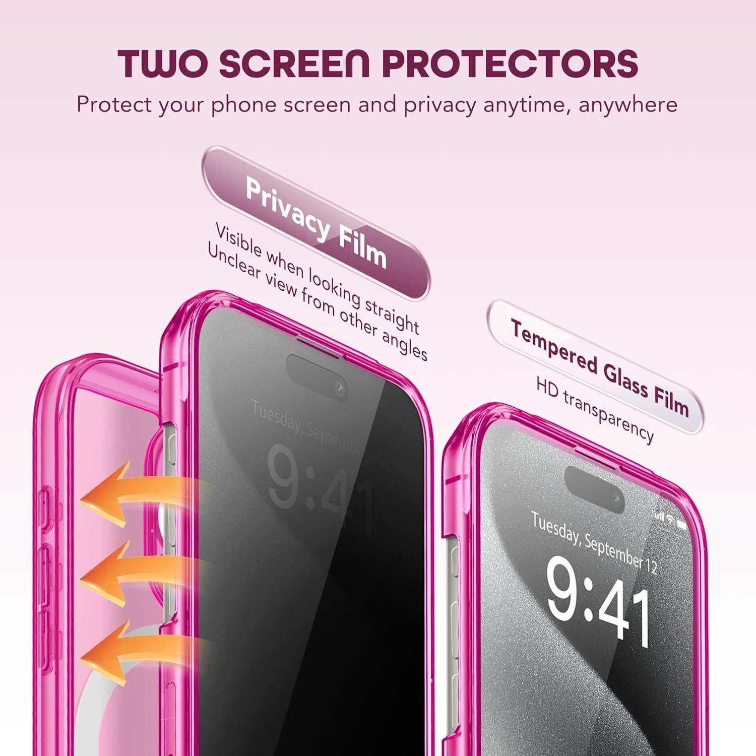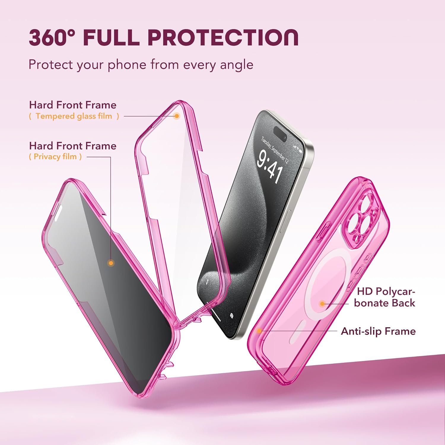Magnetic for iPhone 15 Pro Max Case, [Dustproof Design] Compatible with MagSafe, Built-in 9H Tempered Glass Screen Protector + Privacy Screen Protector & Upgraded Camera Protection,Bright Pink