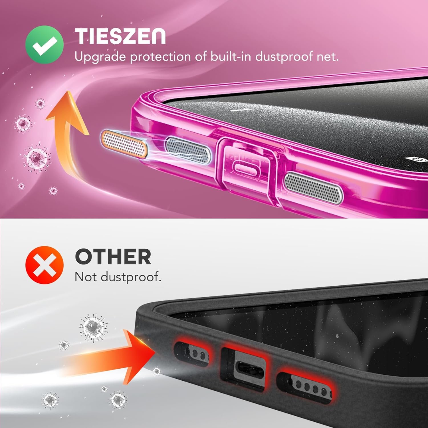 [Upgraded Dustproof Design] The side volume port and bottom charging port of this 15 Pro Max protective case are equipped with newly upgraded dust-proof covers to effectively prevent dust and debris from entering. The speaker hole also come with dust meshes to keep your phone clean at all times while ensuring clear and uninterrupted audio.