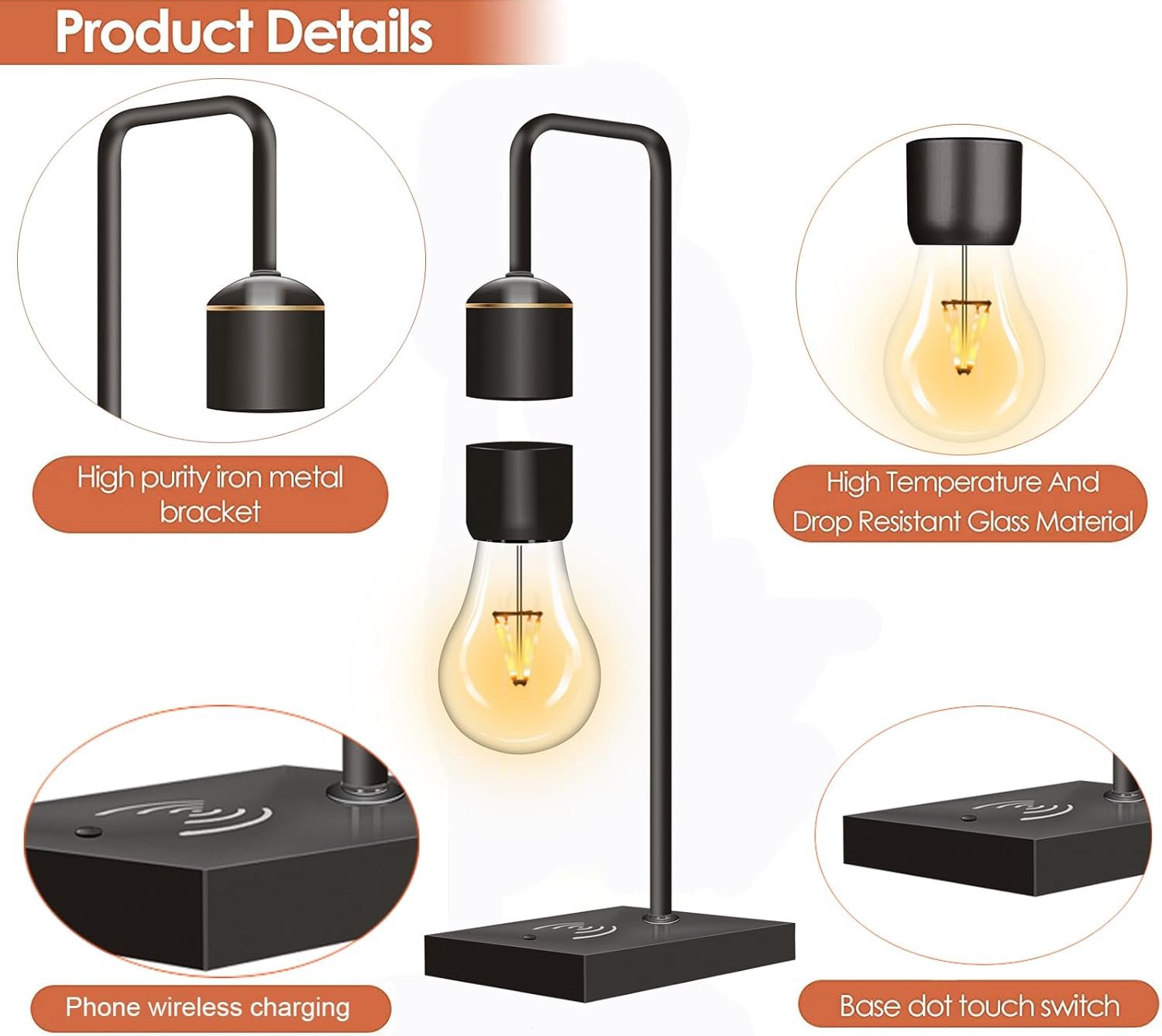 The levitating light bulb lamp features a built in wireless charger for Phones with wireless charging function.