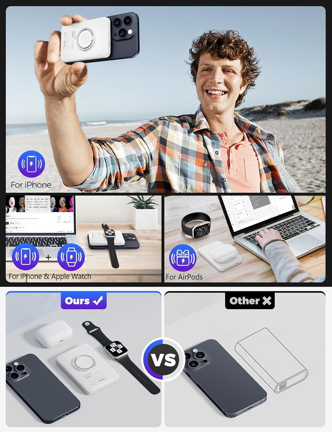 Strong magnetic(for iPhone 12 and above), Magsafe wireless charger for both iPhone and iWatch, ultra compact & lightweight, If you are looking for a small power bank for everyday use and don’t want to carry any cable, please try this slim one