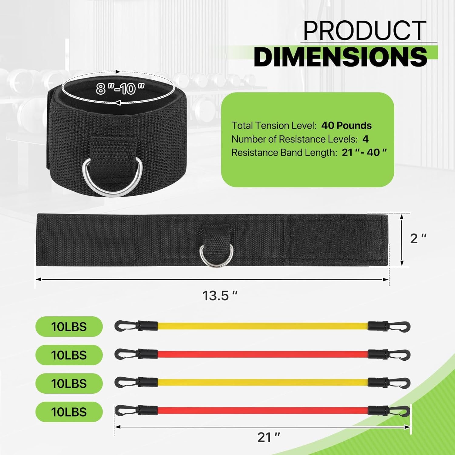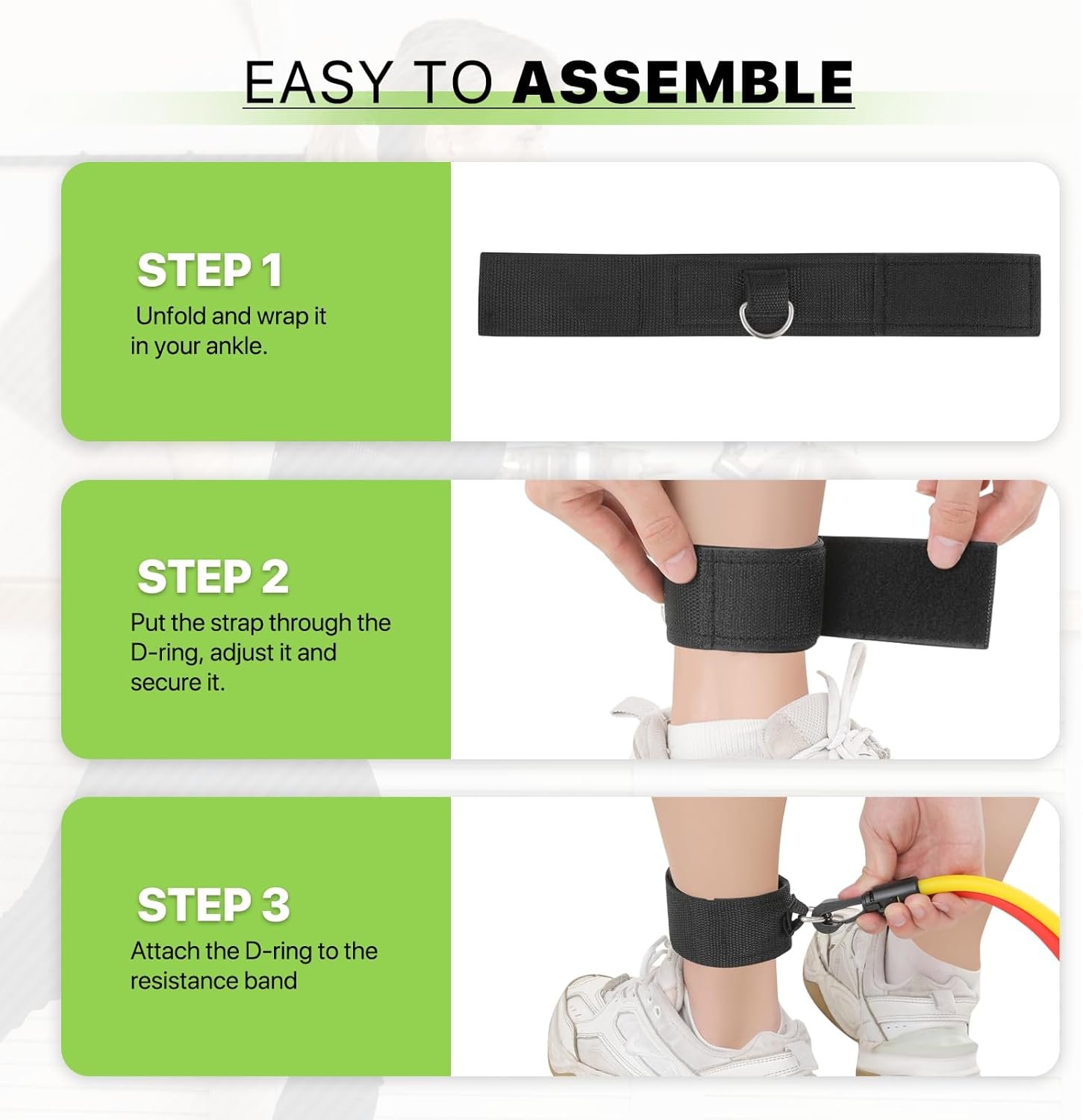Material & Resistant – Our ankle resistance bands is made of high quality PP webbing material that wraps around your ankle in softness and comfort. The matching four resistance bands are made of TPR and the D-ring secure band very well, more peace of mind for your legs and glutes training.