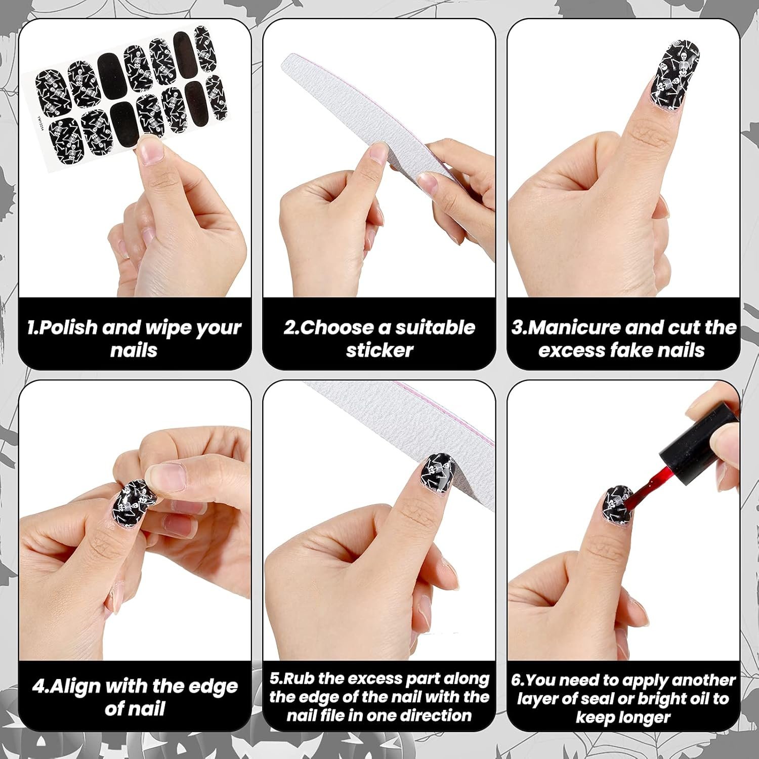 Easy to Use: 3D Self-adhesive Halloween nail stickers make it easy to sticking well on your nail. Just peel it and stick it on your nail. We suggest you can also use nail gel top coat to cover to make the stickers last longer.