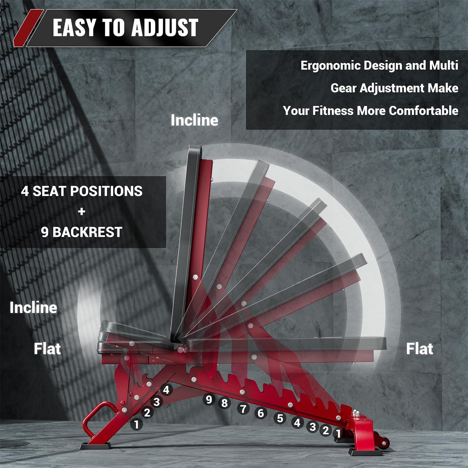 Quick and Safe Adjustments: Enjoy hassle-free adjustments with our C-shaped lock catch, which eliminates the need for cumbersome pin-pulling. The exercise bench offers 9 backrest positions and 4 seat positions, allowing for incline, flat, and decline configurations. You can even achieve a 90-degree angle, making it an ideal incline bench for a comprehensive range of exercises targeting your abs, arms, shoulders, back, and chest