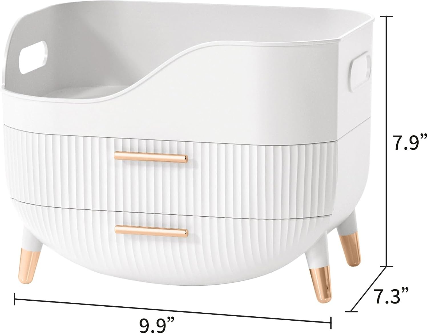 Appearance and size:9.9”L×7.3”W×7.9”H,Large capacity cosmetic organizer with 2 drawers and top compartment,can organize tall bottles of skincare and cosmetics,Household containers for storing and organizing makeup