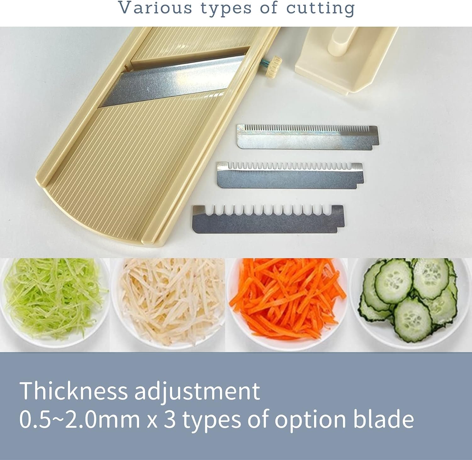 Various types of cutting: Thickness adjustment 0.5~2.0mm x 3 types of option blade. Waffle Fries.